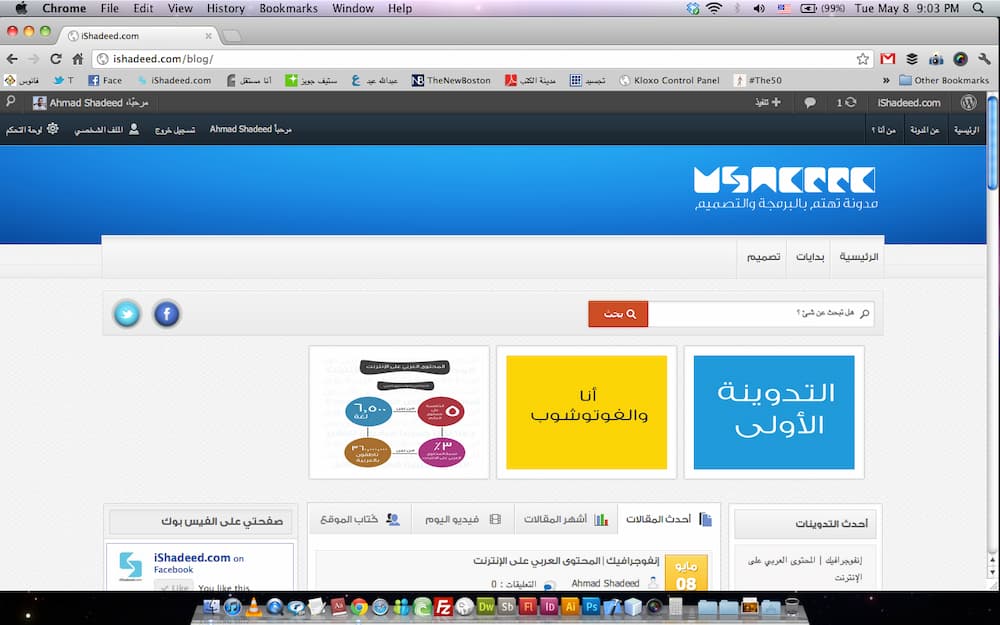 A screenshot of the first design of ishadeed.com in May 2012. It was an Arabic blog and built with a ready-made wordpress theme by the Eygption designer Salah Elimam.