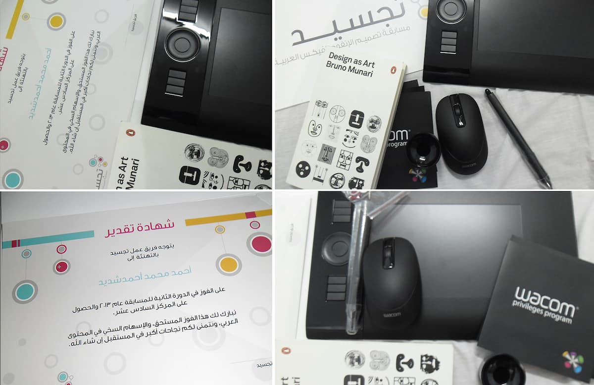 Tajseed prize: Wacom intuos, certificate, and a design book.