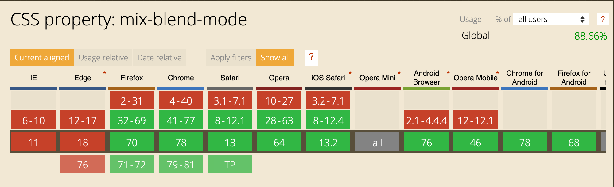 At the time of writing, the support for mix-blend-mode and background-blend-mode is great except that it’s not supported in Microsoft Edge. Make sure to provide a proper fallback when using them.