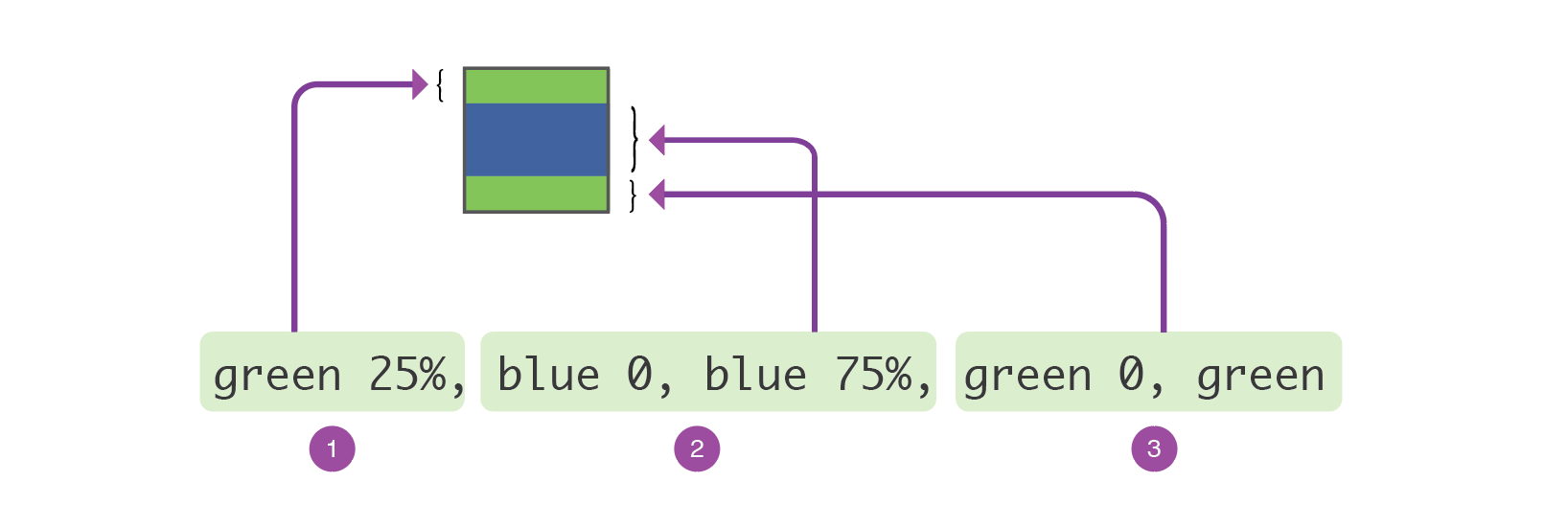 The first gradient starts from zero to 25%, which is green. Then, it continue from 25% to 75%, which is blue. Finally, it goes 75% to 100% in green.