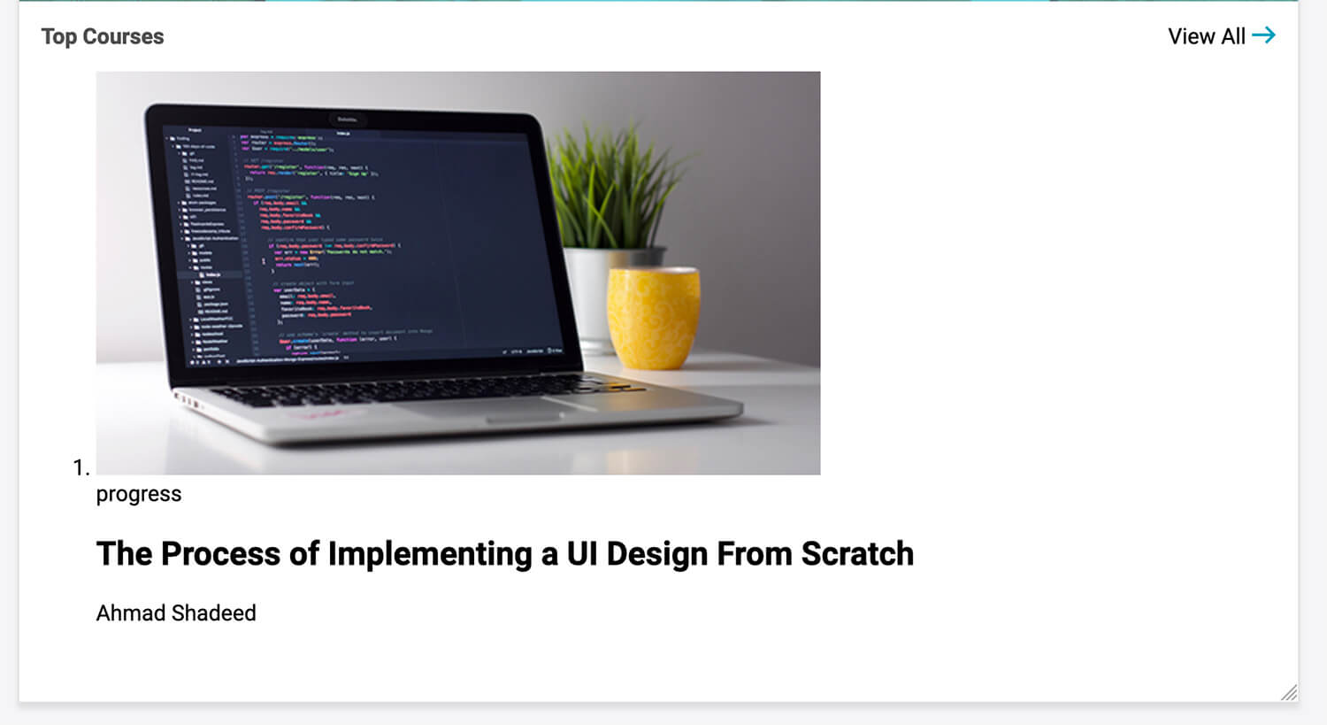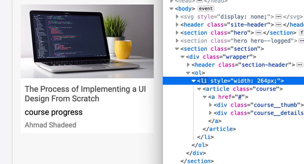 If you notice, the course thumbnail is large and taking a lot of space. I will add a temporarily inline CSS for the <li>. This will act as a limit so I can focus on building the course component.