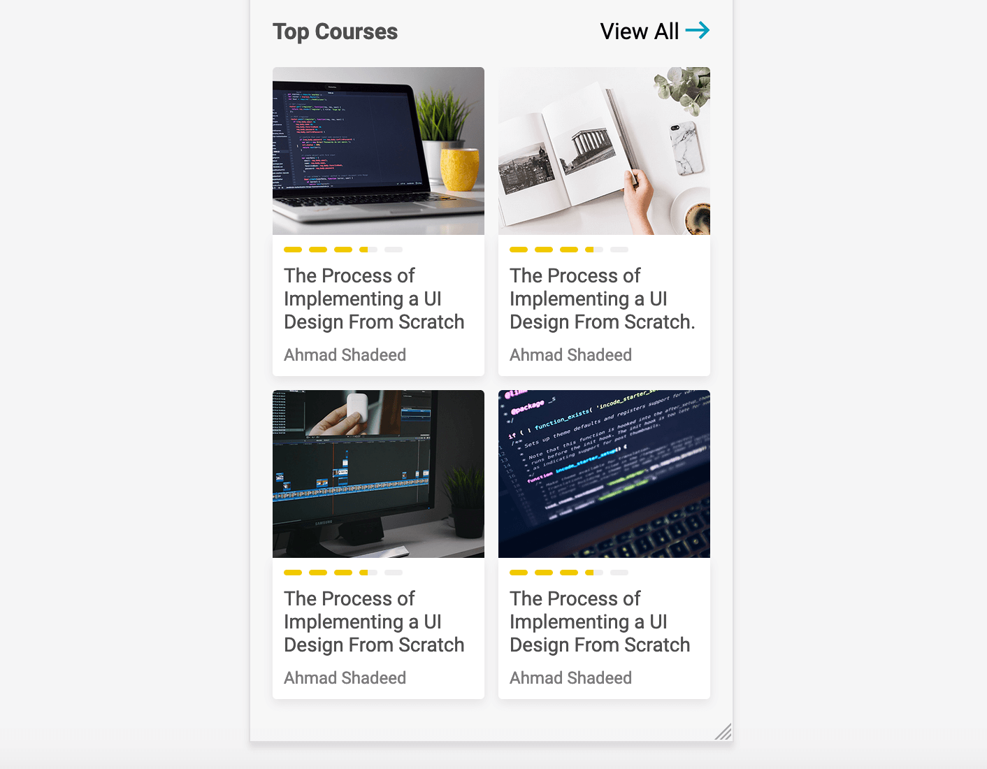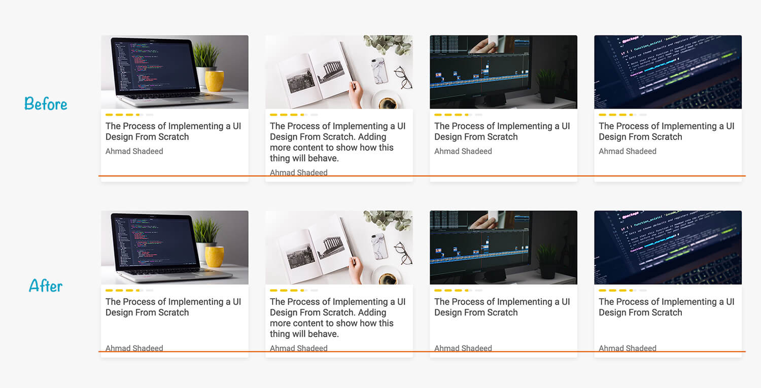 In case one of the courses title was long, the author names are not aligned at the same line. In order to fix that, I will add margin-top: auto to the .course__details element (The one that contains the title, progress and author).