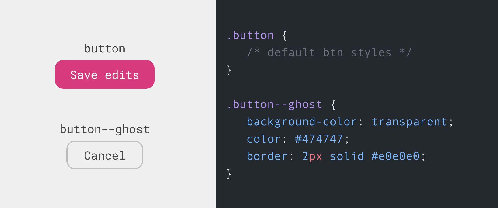 We have a button with two styles, the default and the ghost ones. In HTML, here how we will use them: