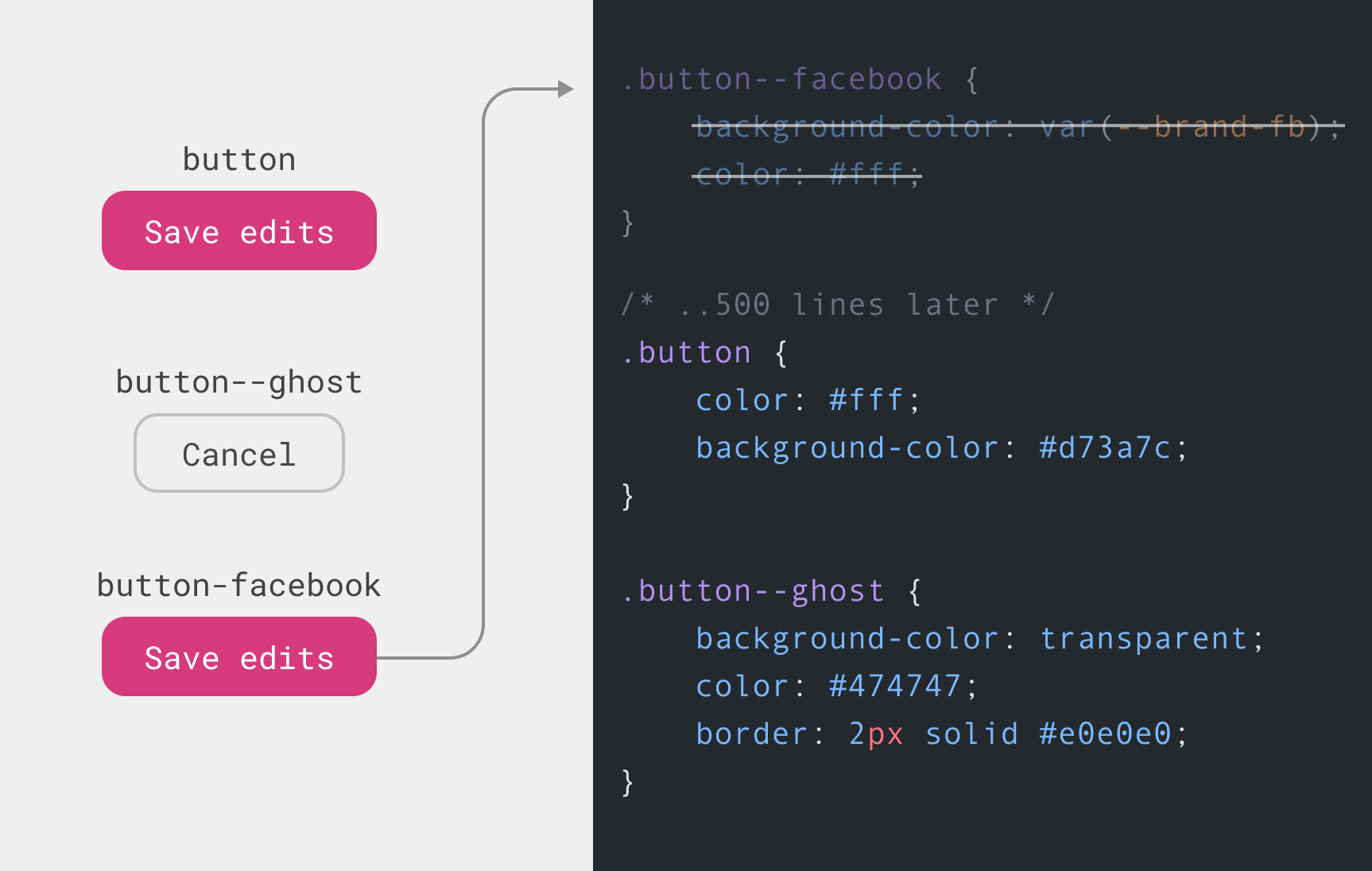 The browser will add the .button--facebook right after the .button--ghost in the variations layer. Here is a visual for more clarity: