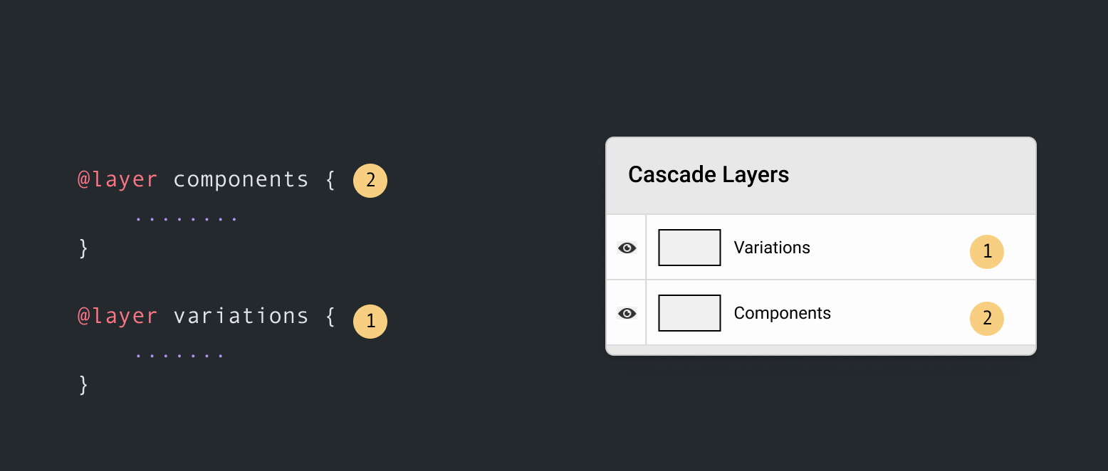 Back to our example. The initial problem was that we needed to create another variation of the button but we added it in a place that makes the variation button have less specificity. With Cascade layers, we can add the CSS in the variations layer.