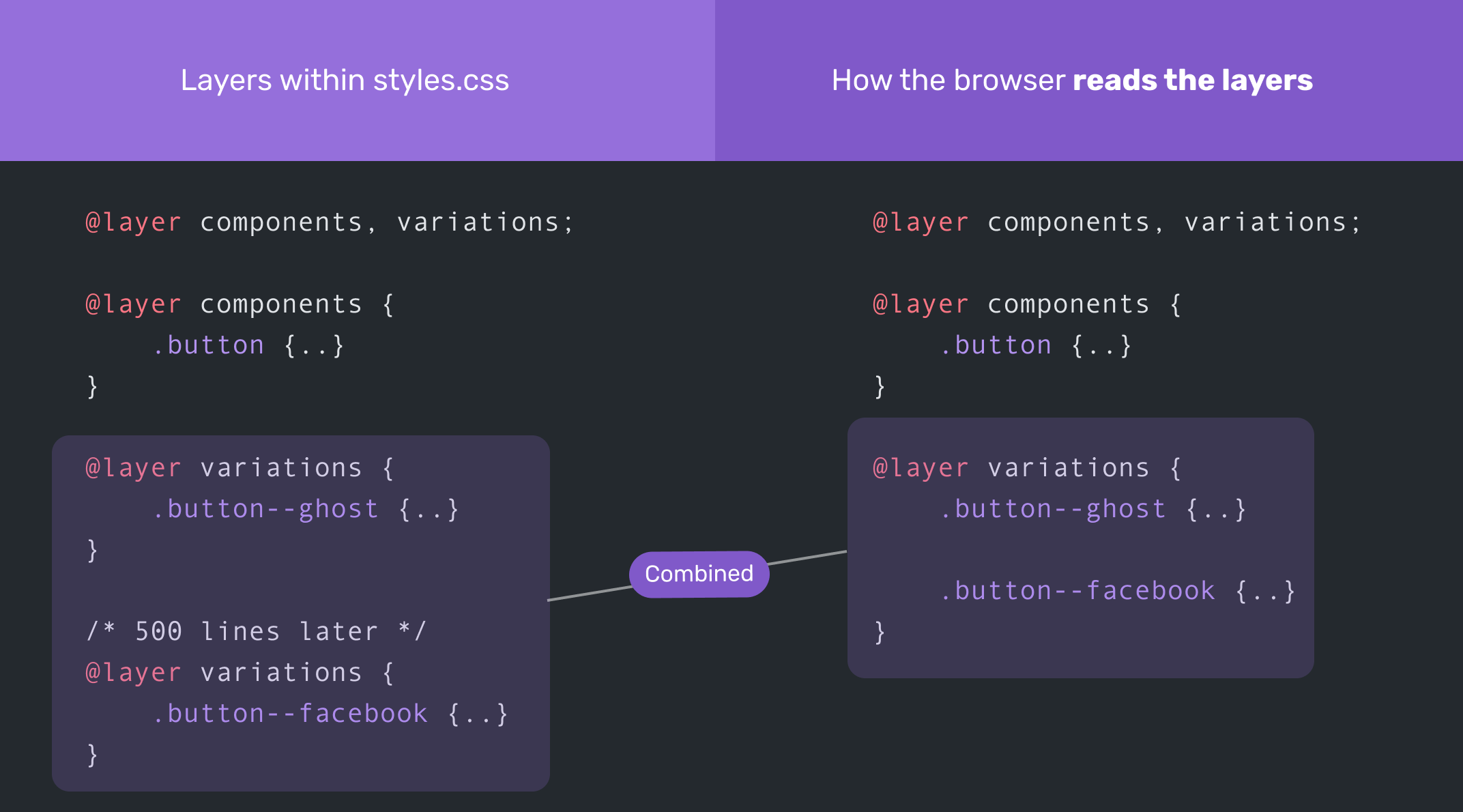 In cascade layers, the browser combines styles from the same @layer definitions and reads them at once, as per their order.