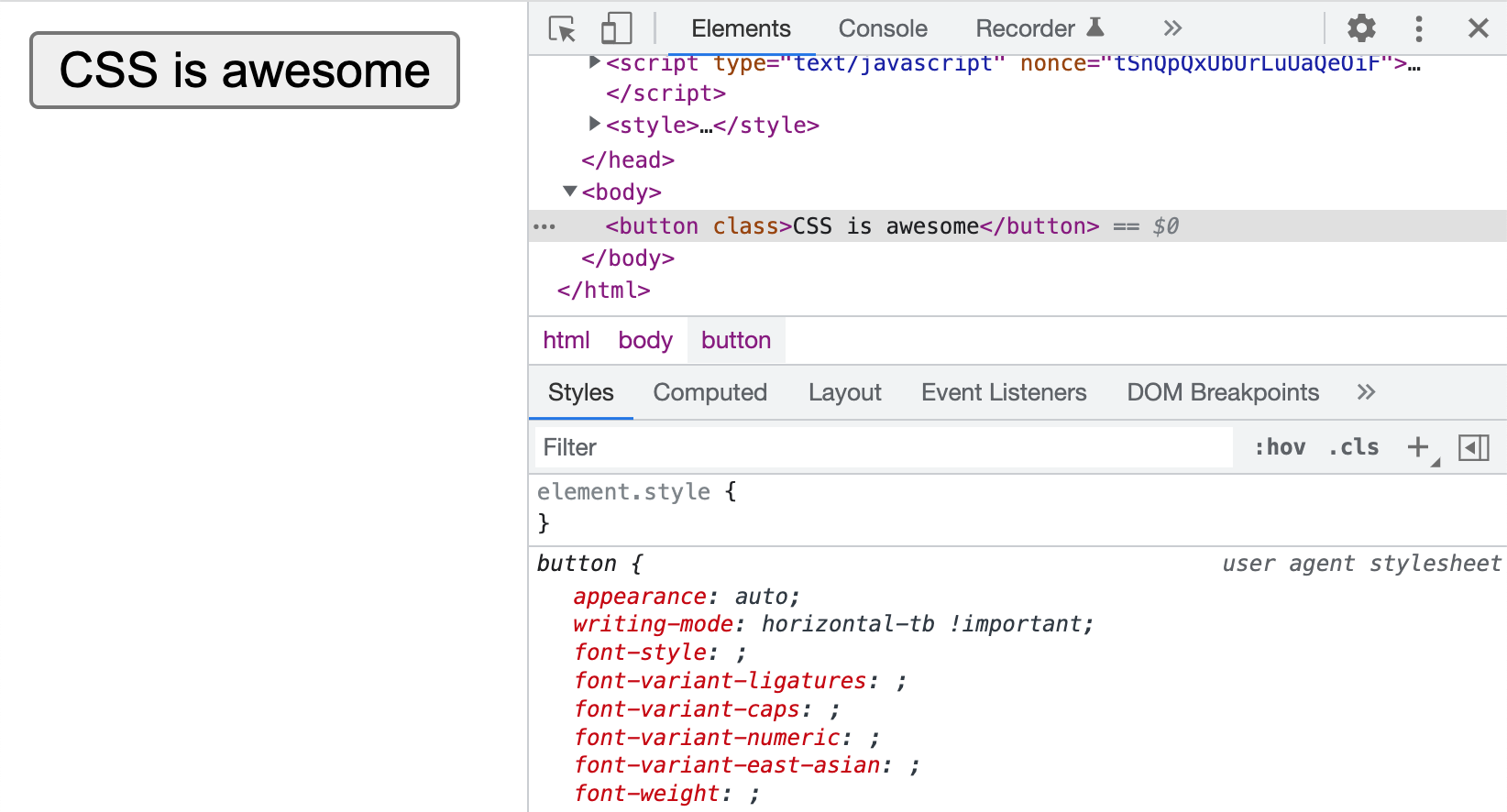 If you inspect the default button, you will notice user agent stylesheet, which shows all the default styles that the button has.