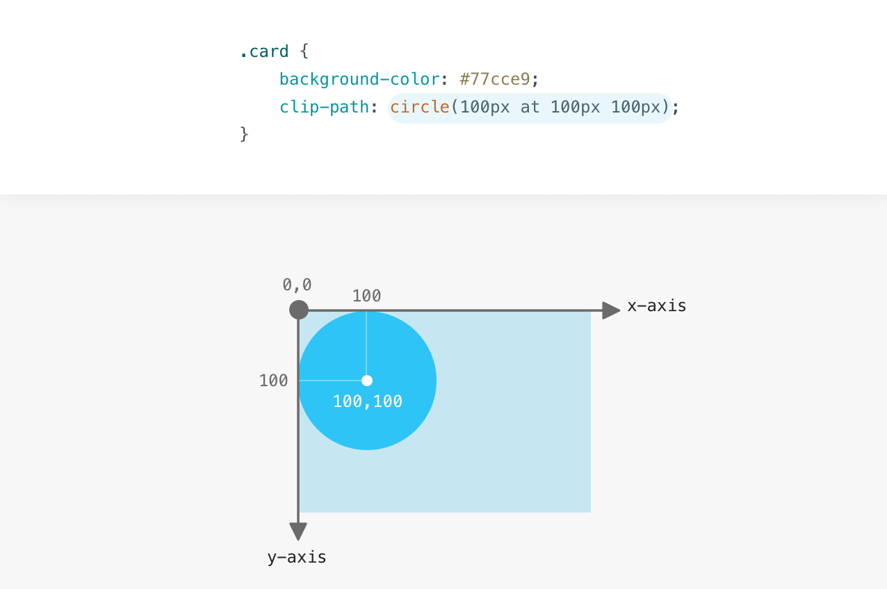 The circle’s center is positioned 100px from the left and 100px from the top. Now that you understand how the coordinate system works, I will explain the possible values for the clip-path property.