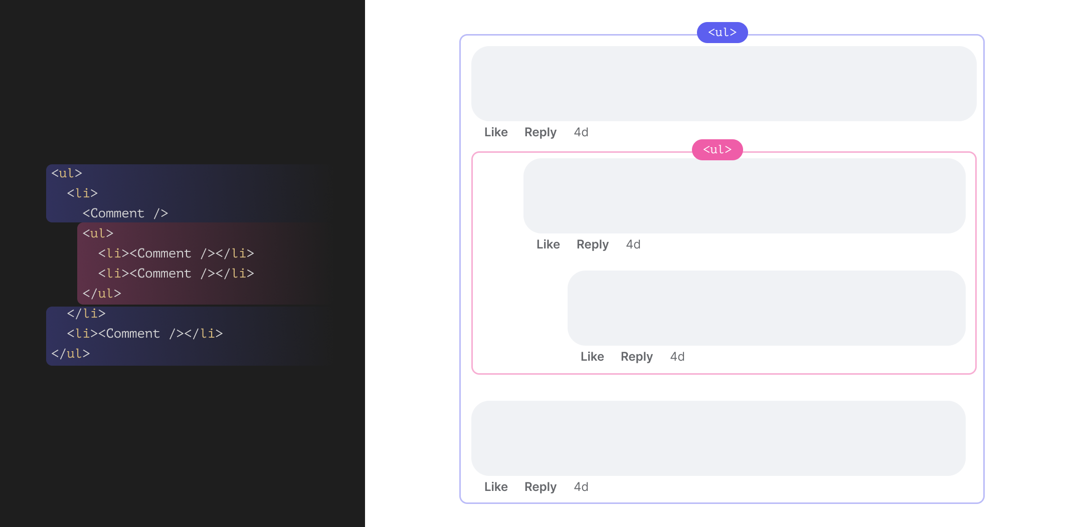 The <Comment /> acts as a placeholder for the comment component. That is the HTML for a list of two comments without any replies.