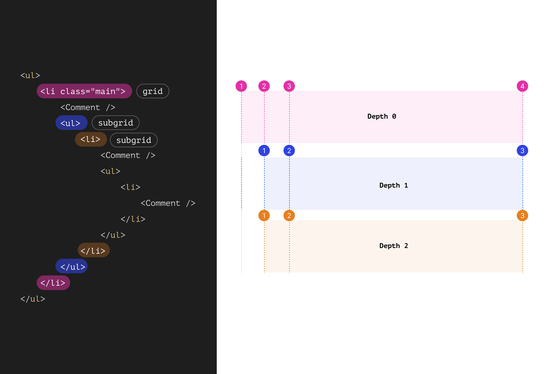 The .comment component will always span the full width. That’s why I added grid-column: 1 / -1. It means: “span the comment from the first to the last column”. This is helpful to avoid entering the column number manually for each depth in the nesting. Something like this: