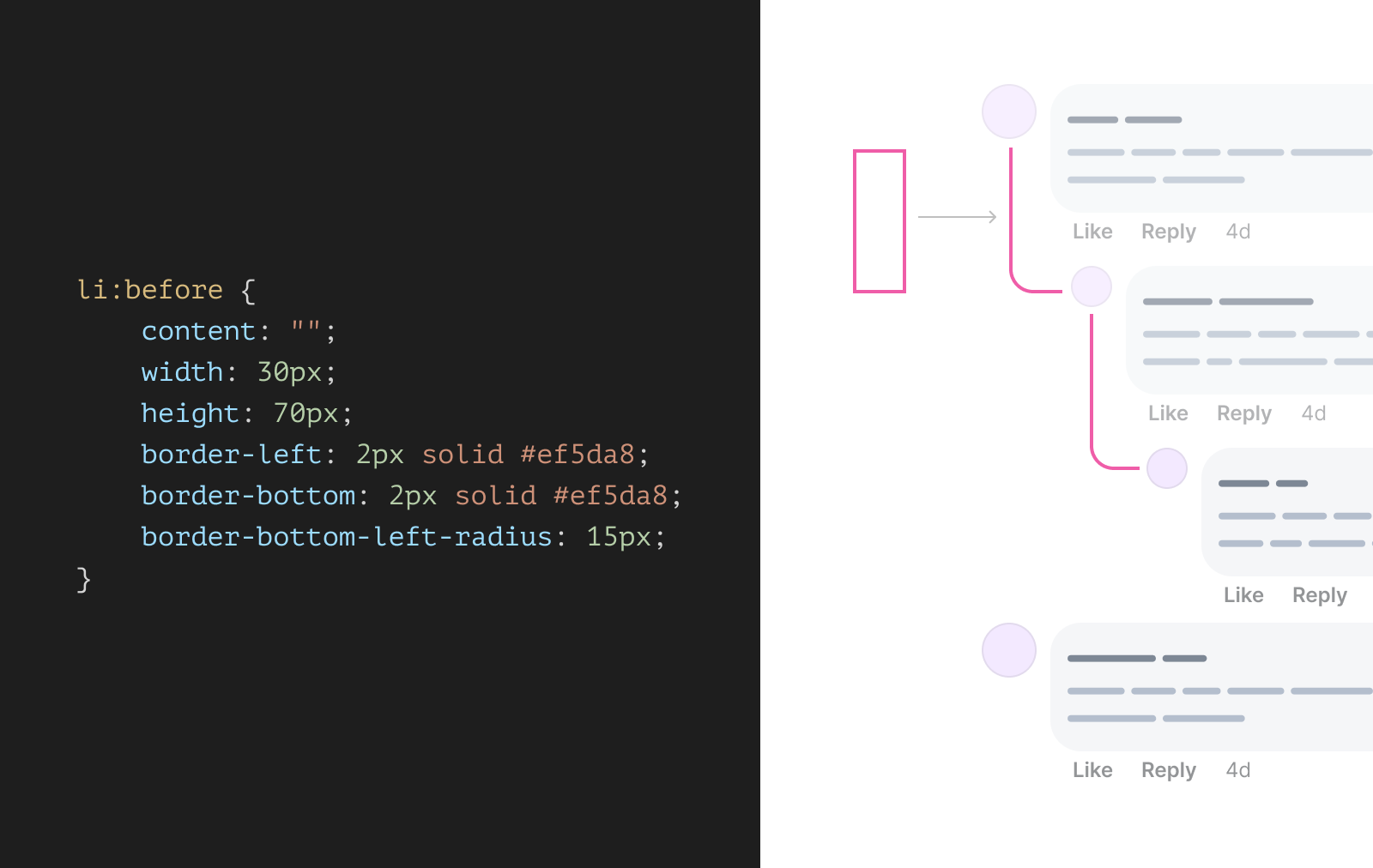 Next, we need the line and curved element for the depth: 1 replies. This time, the <li> will use both the :before and :after pseudo-elements.