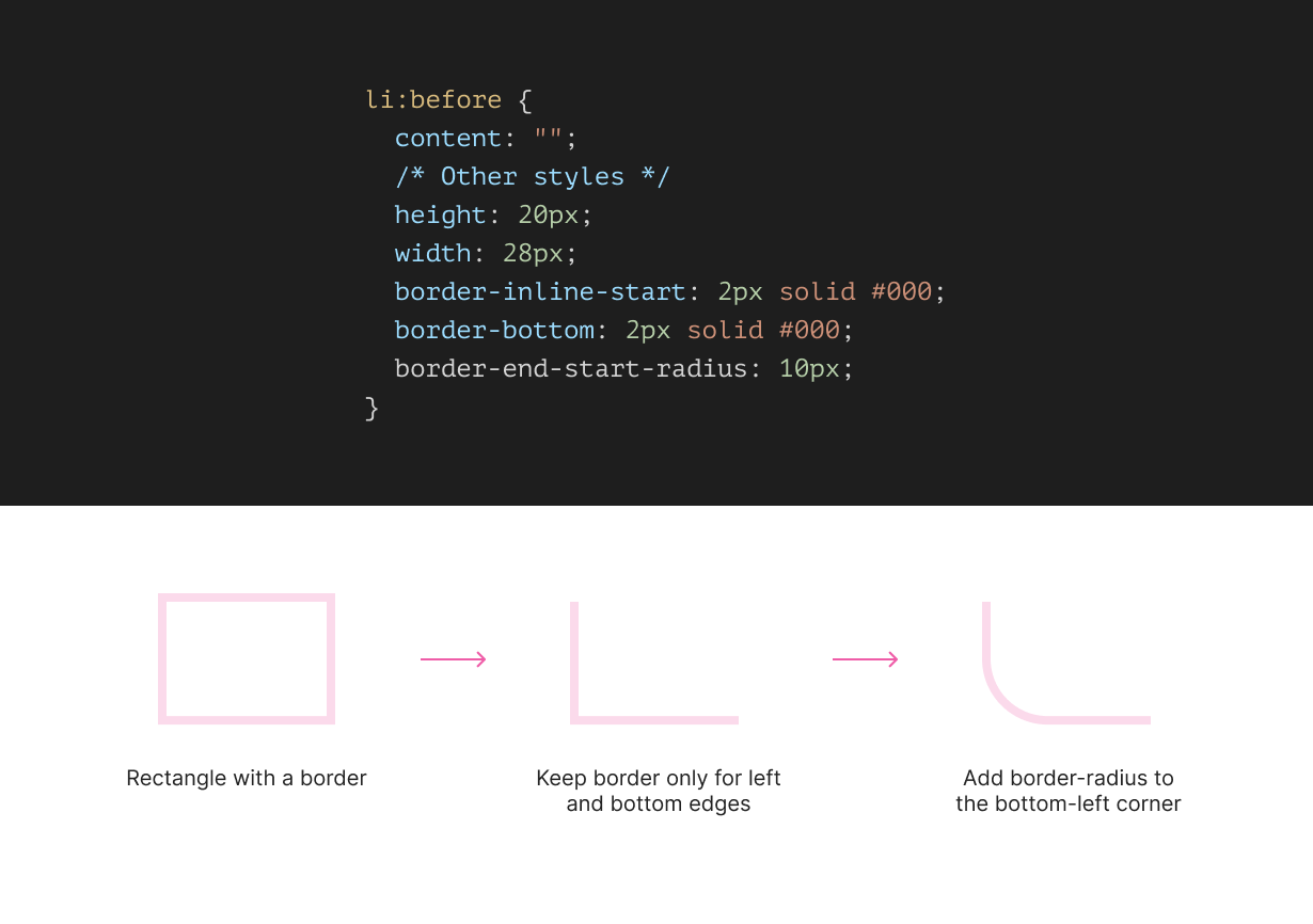 At first, your mind might try to trick you into: “Hey, this looks like a rectangle with a left and bottom border and a border radius on the bottom left corner”.