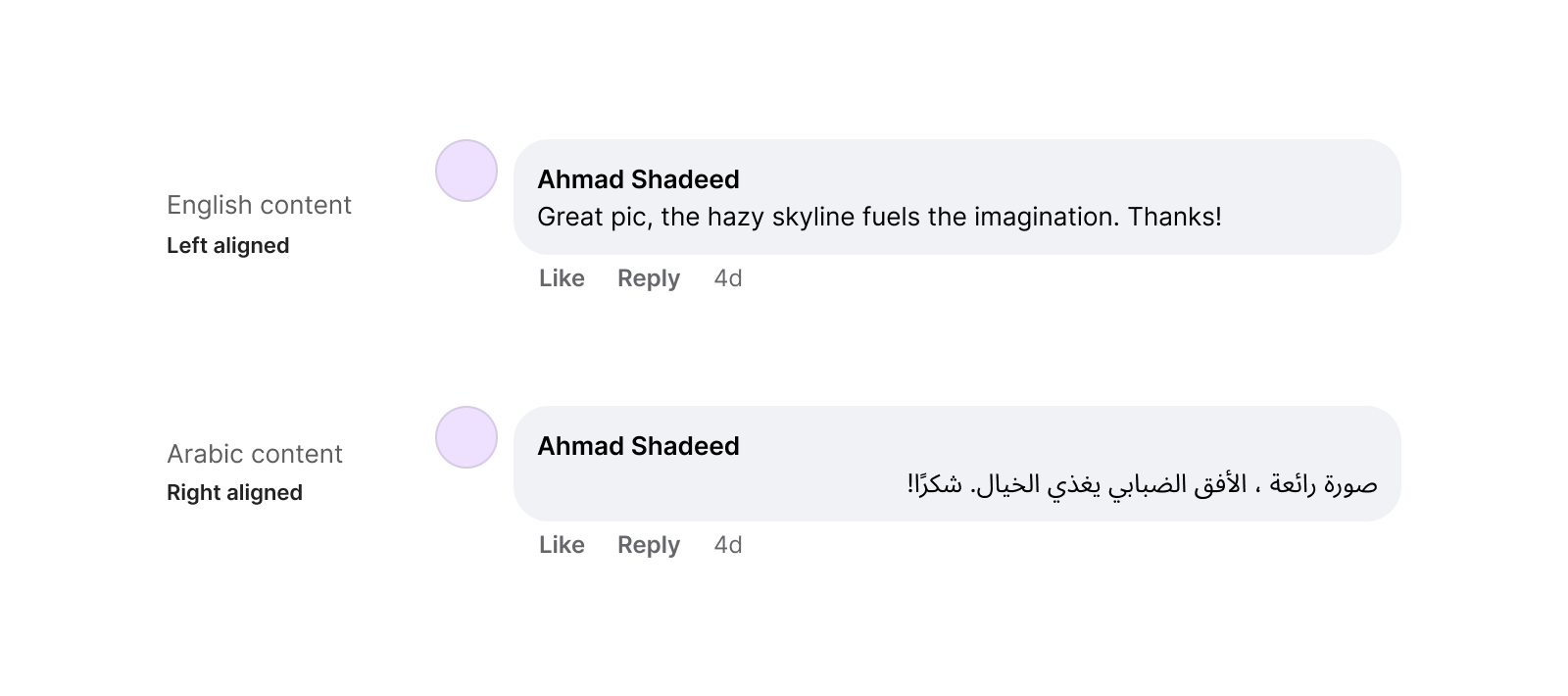A comment might contain a left-to-right (LTR) or right-to-left (RTL) language. The text alignment should be different based on the content language. Thanks to dir=auto HTML attribute, we can let the browser do that for us.