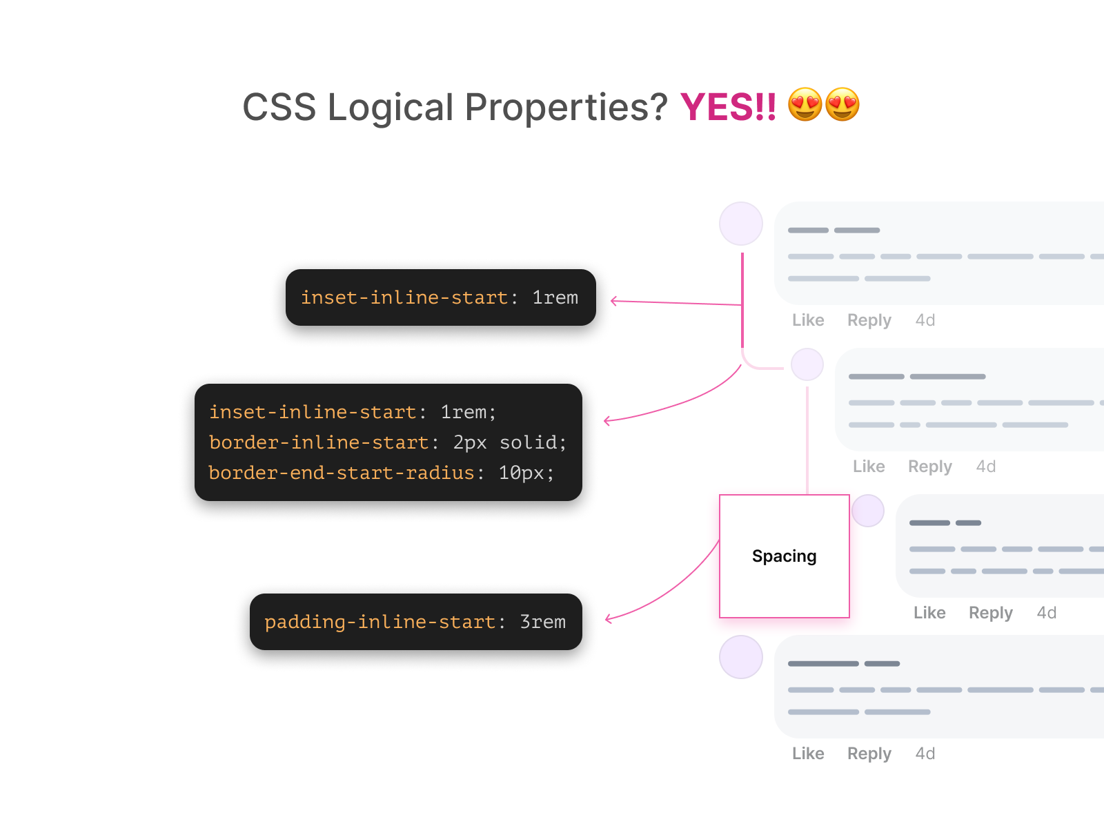 By using CSS logical properties, we can build the comment component in a way that changes based on the document direction. The same applies to the connecting lines, too.