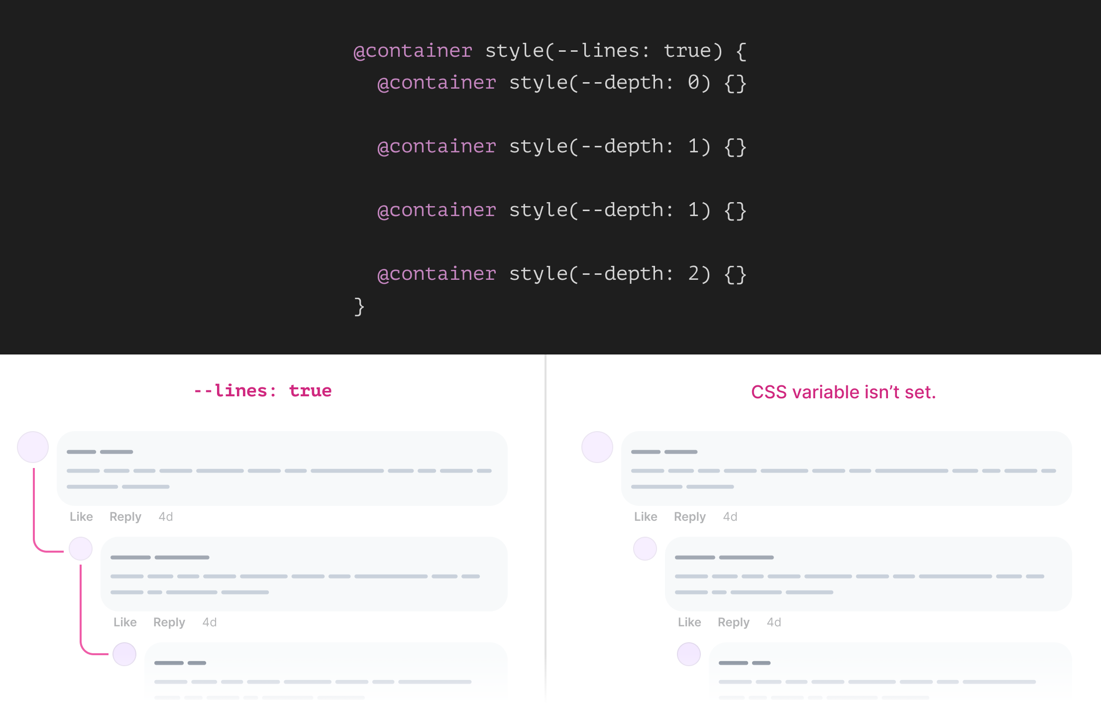 The above is just an example of why I prefer using style queries over HTML data attributes for handling the depth of the comment and replies.