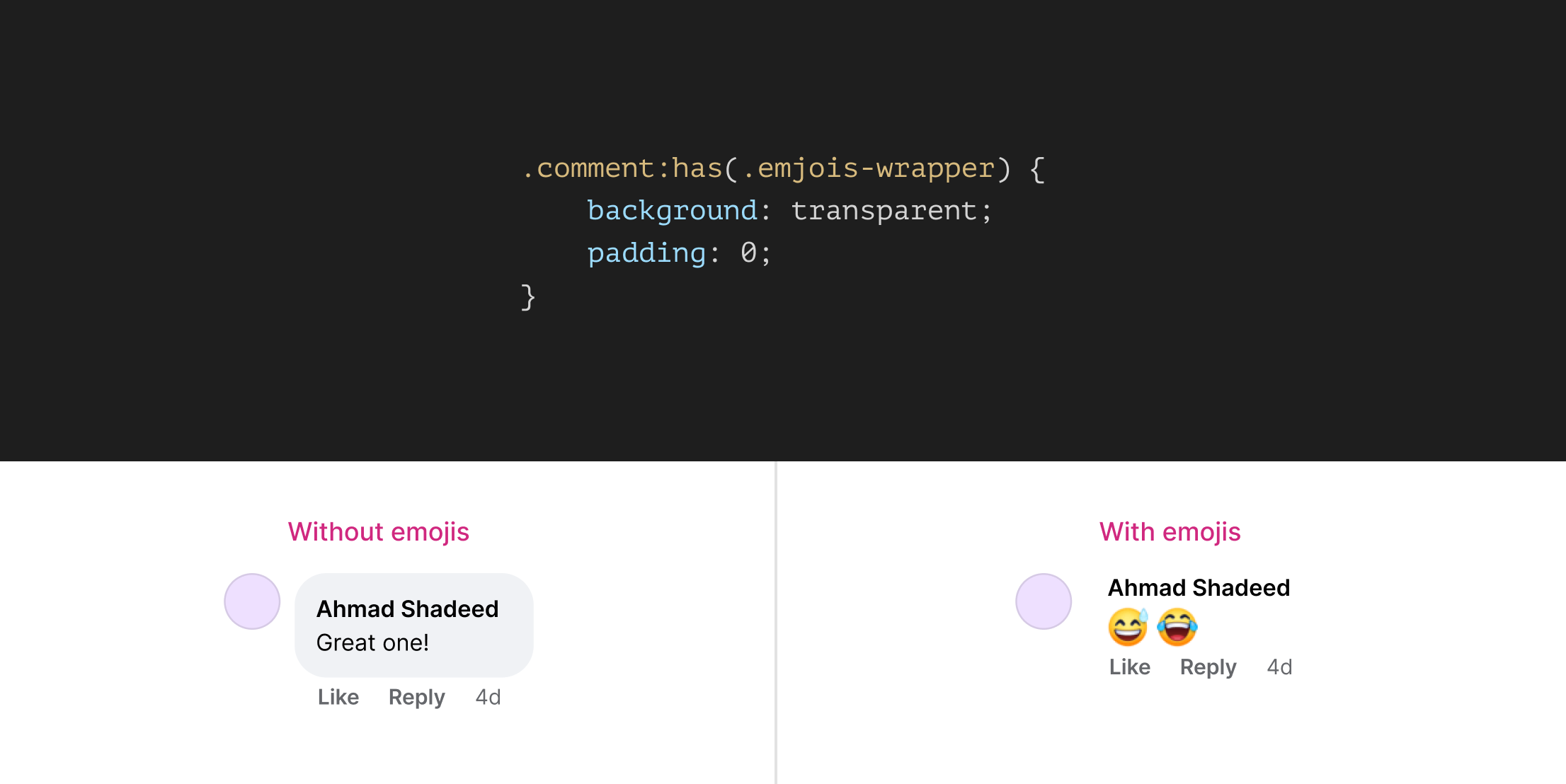 When the user adds a comment that consists of emojis only, the containing wrapper will change a bit: