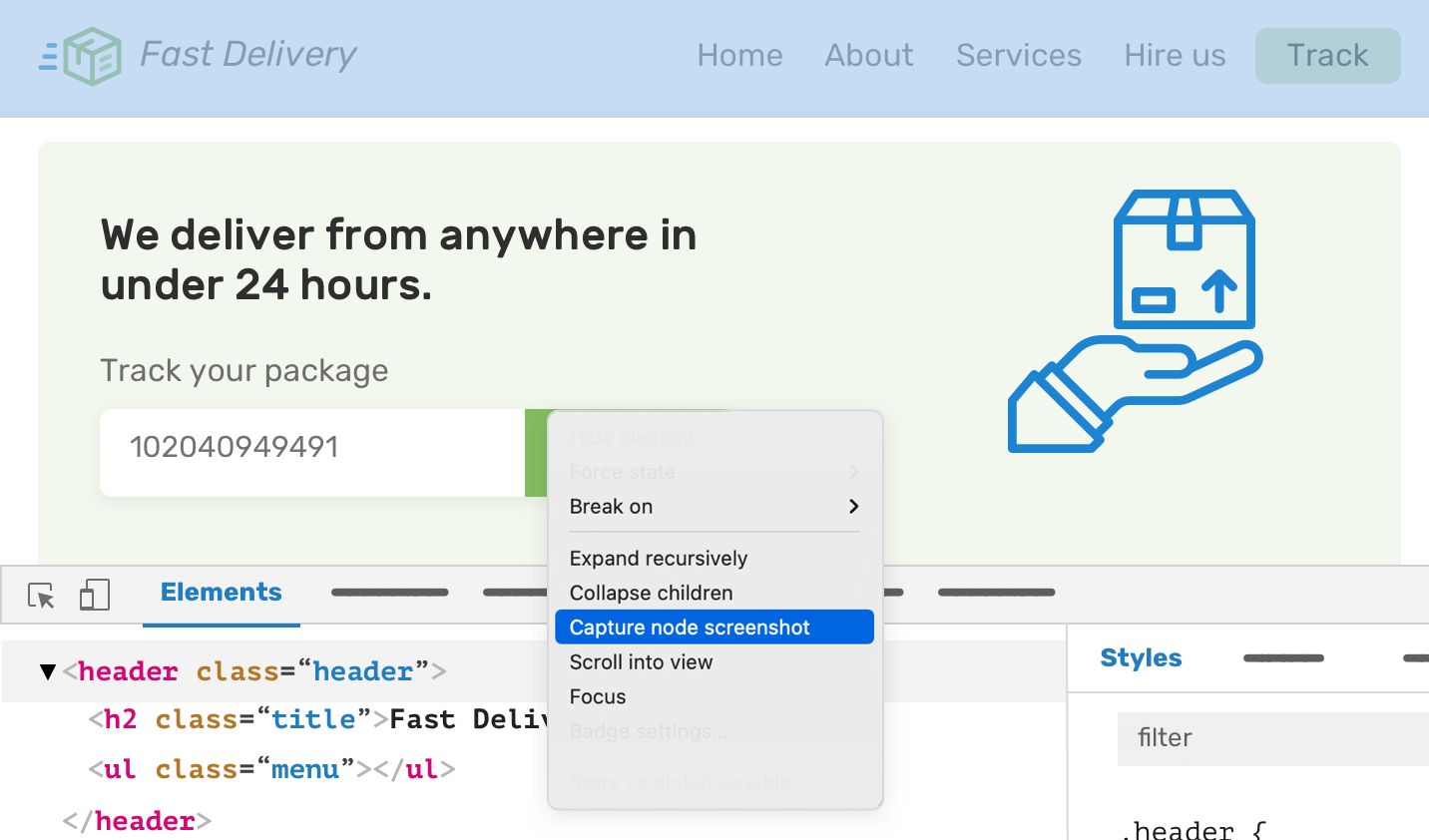 We can also take a screenshot of a specific section or component, and compare it against the design mockup. In the DevTools, select the HTML element you want and then select “Screenshot Node” from the dropdown menu.