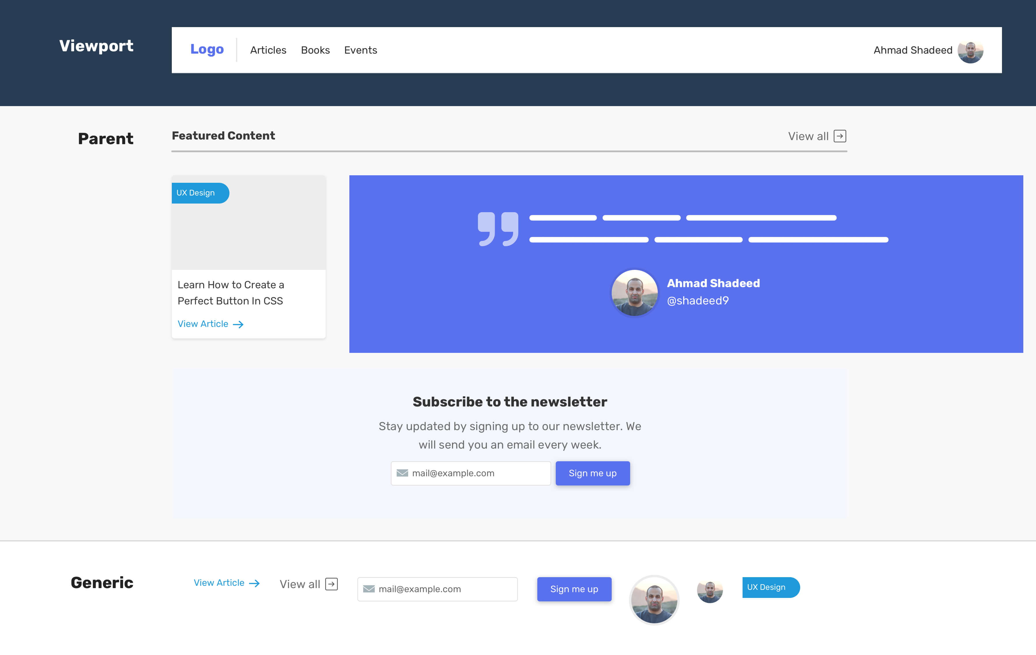 Notice that we have the header, articles section, quotation, and newsletter. Each one of them should adapt to either the viewport width of the parent width.