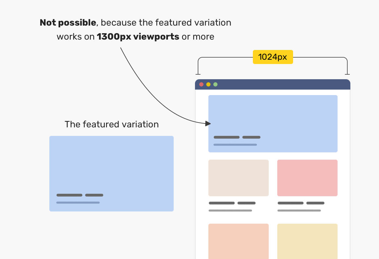 The problem is that the developer is tied with using a variation of a component only when the viewport width is greater than a specific value. For example, if I want to use the “featured” variation in the tablet size, it won’t work, why? Because the media query for it kicks in at 1300px viewport width or more.