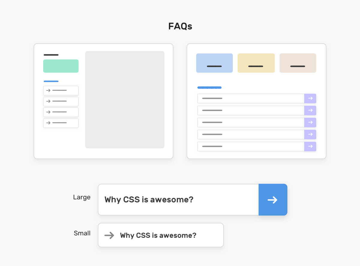 An accordion pattern can be used for things like FAQs. In some cases, we might need to add an FQAs list within a sidebar or a small area in the UI rather. Container queries can help!