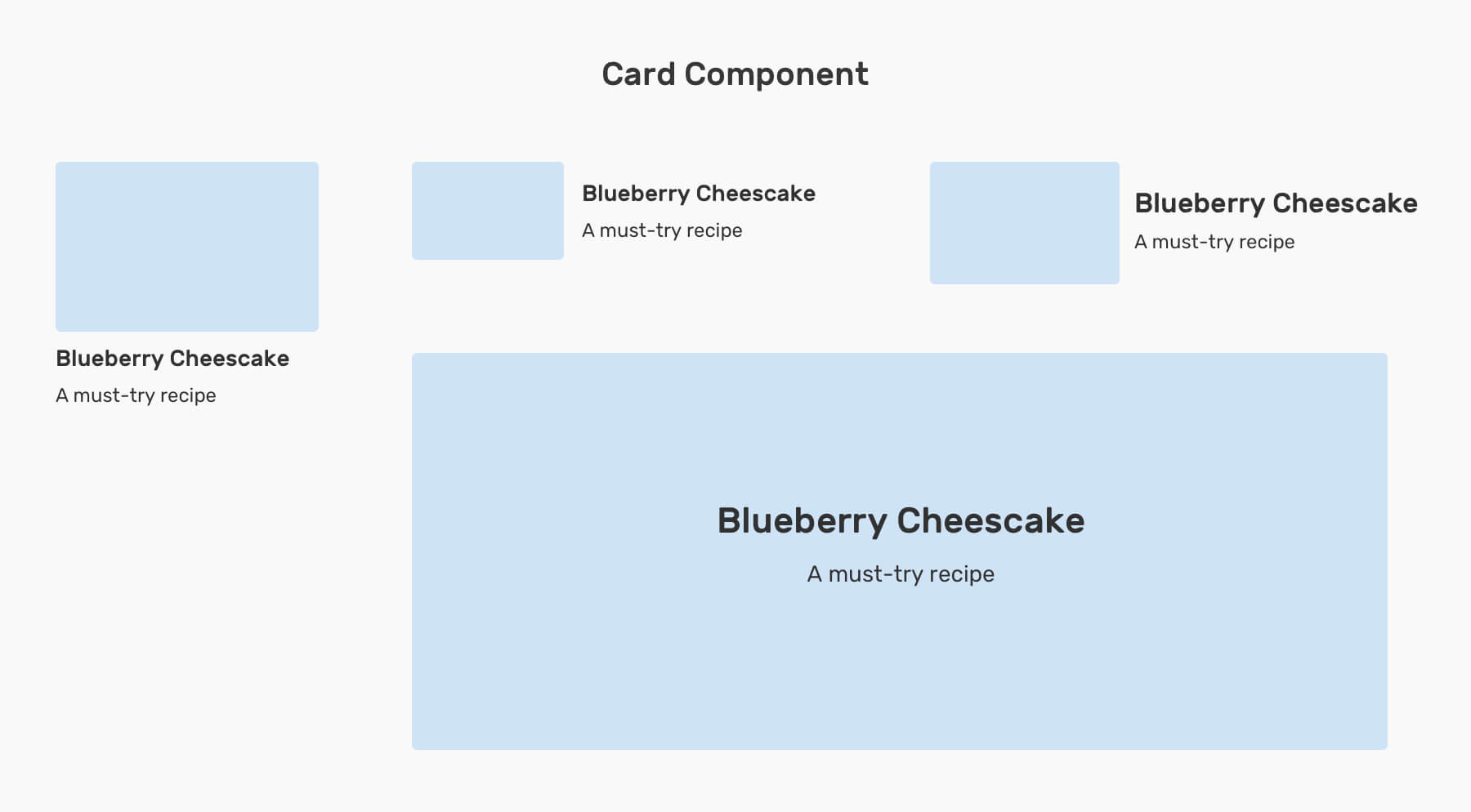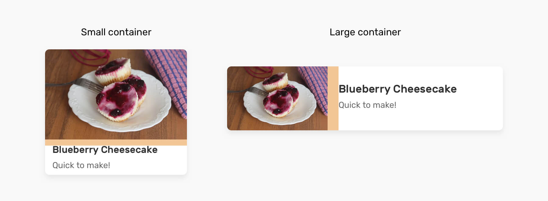 We have a card component that starts with a stacked style, all the way to the hero-like style when the container is large. For such a component, we might need to alter these things: