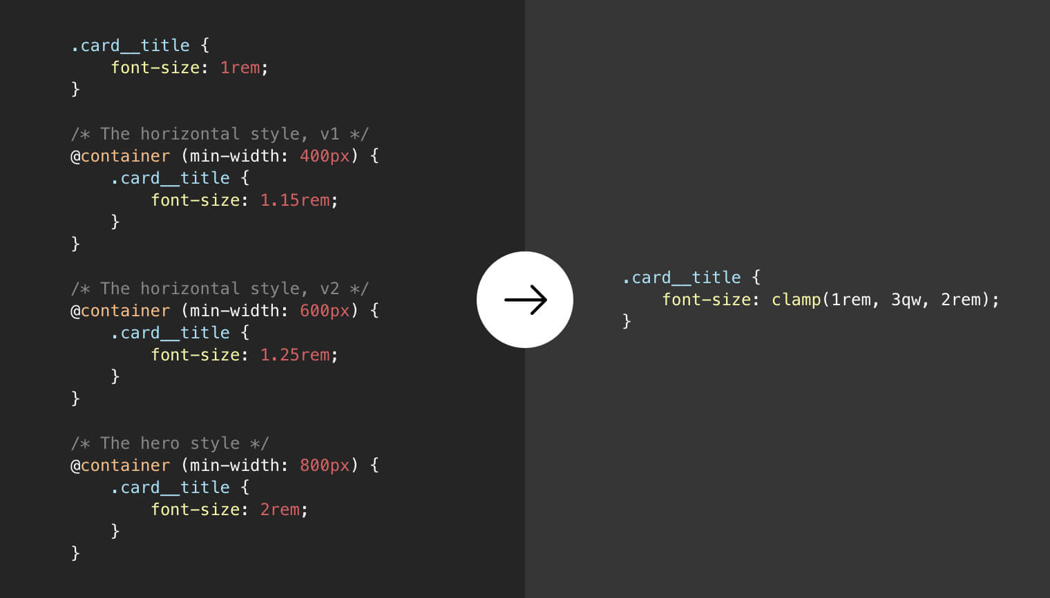 Notice how the .card__title font size is being changed with different container queries. We can enhance that and avoid duplicating font-size by using query units along with CSS clamp() function.