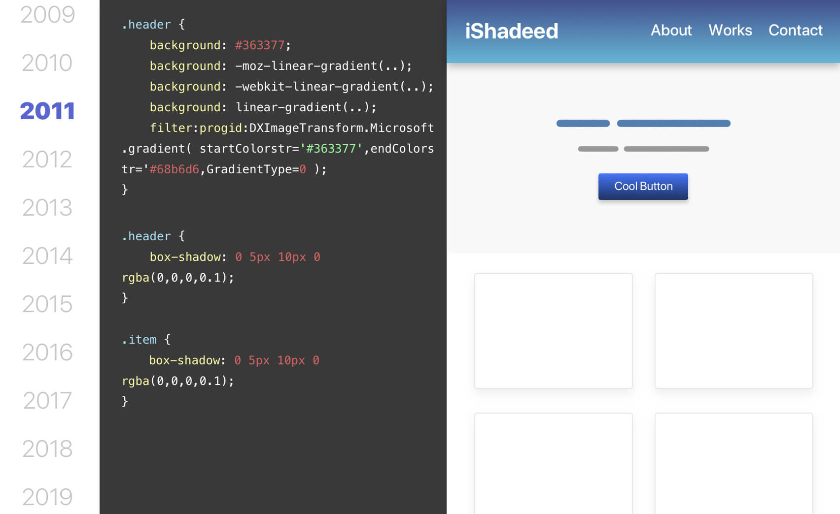 I wasn’t even a front-end developer in 2011, but with a quick research, I see the popularity of new CSS3 features like gradients, drop shadows, and such tiny nice details.