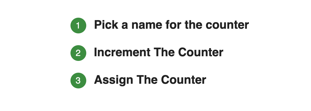 The final step is to use the counter() function as a value for the content property. We have a lot of flexibility here which I will explain in the upcoming examples. For now, I added the following: