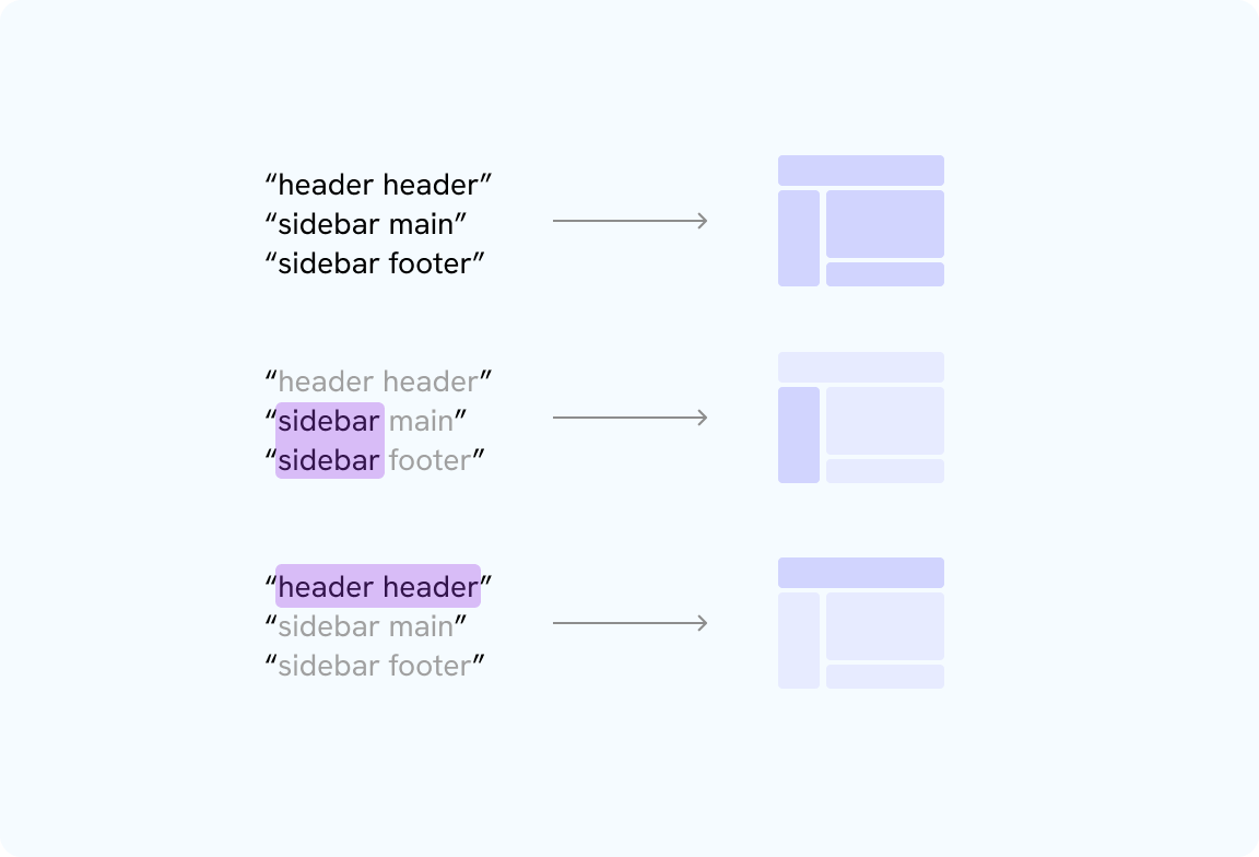 To use CSS grid template areas, we need to define the grid areas via grid-template-areas property. The main things you need to know for now: