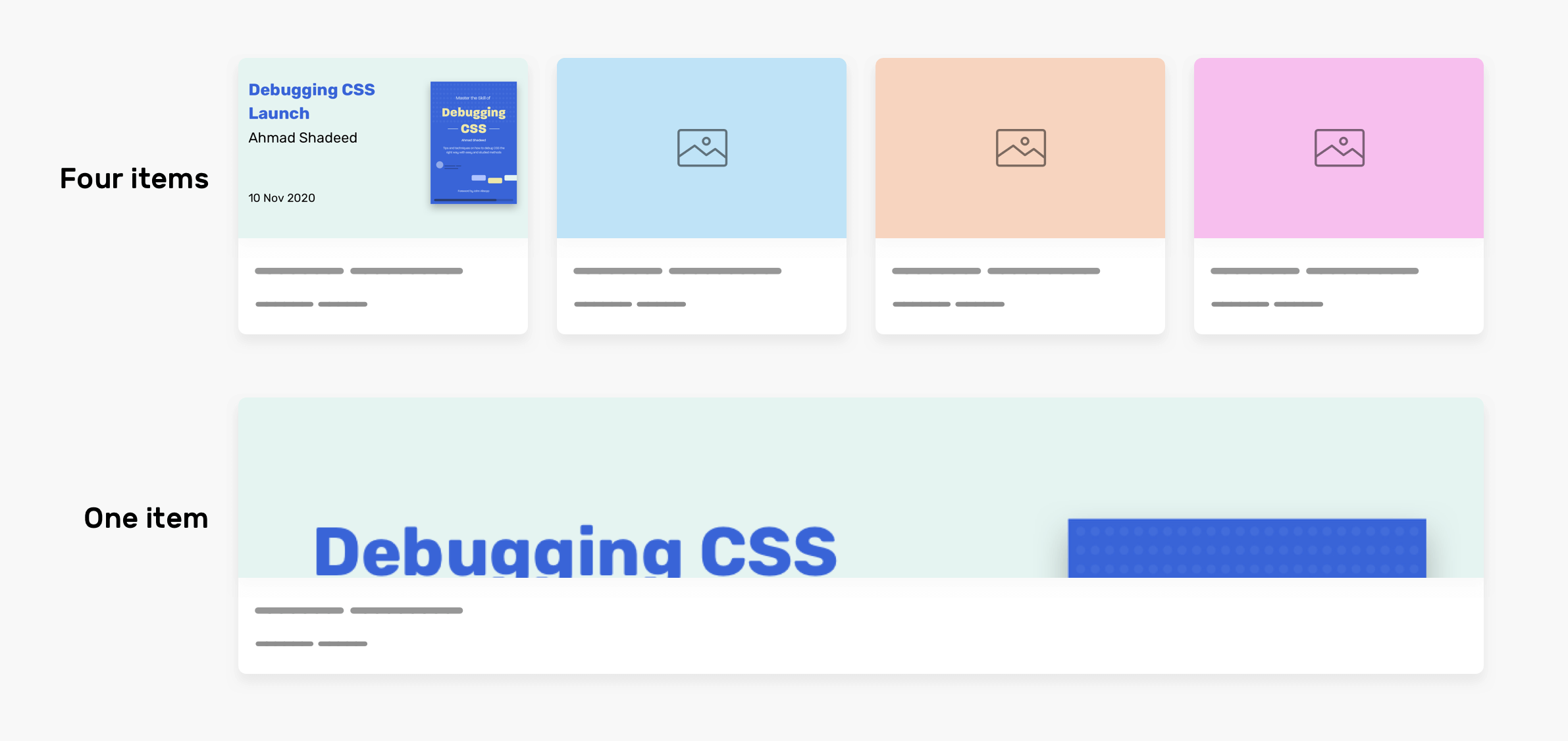 A grid of cards that looks perfect when we have four columns. However, when there is only one card only, it will expand to fill the available remaining space.