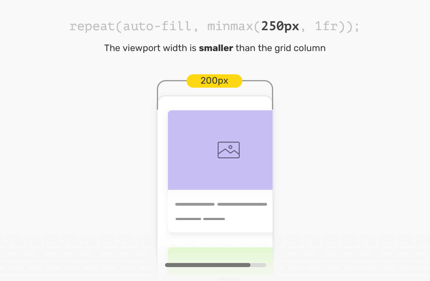 When I started learning CSS grid, reading the value of grid-template-columns in this use-case was scary. It’s important to pay attention to viewports below 250px, as there will be a horizontal scrollbar.