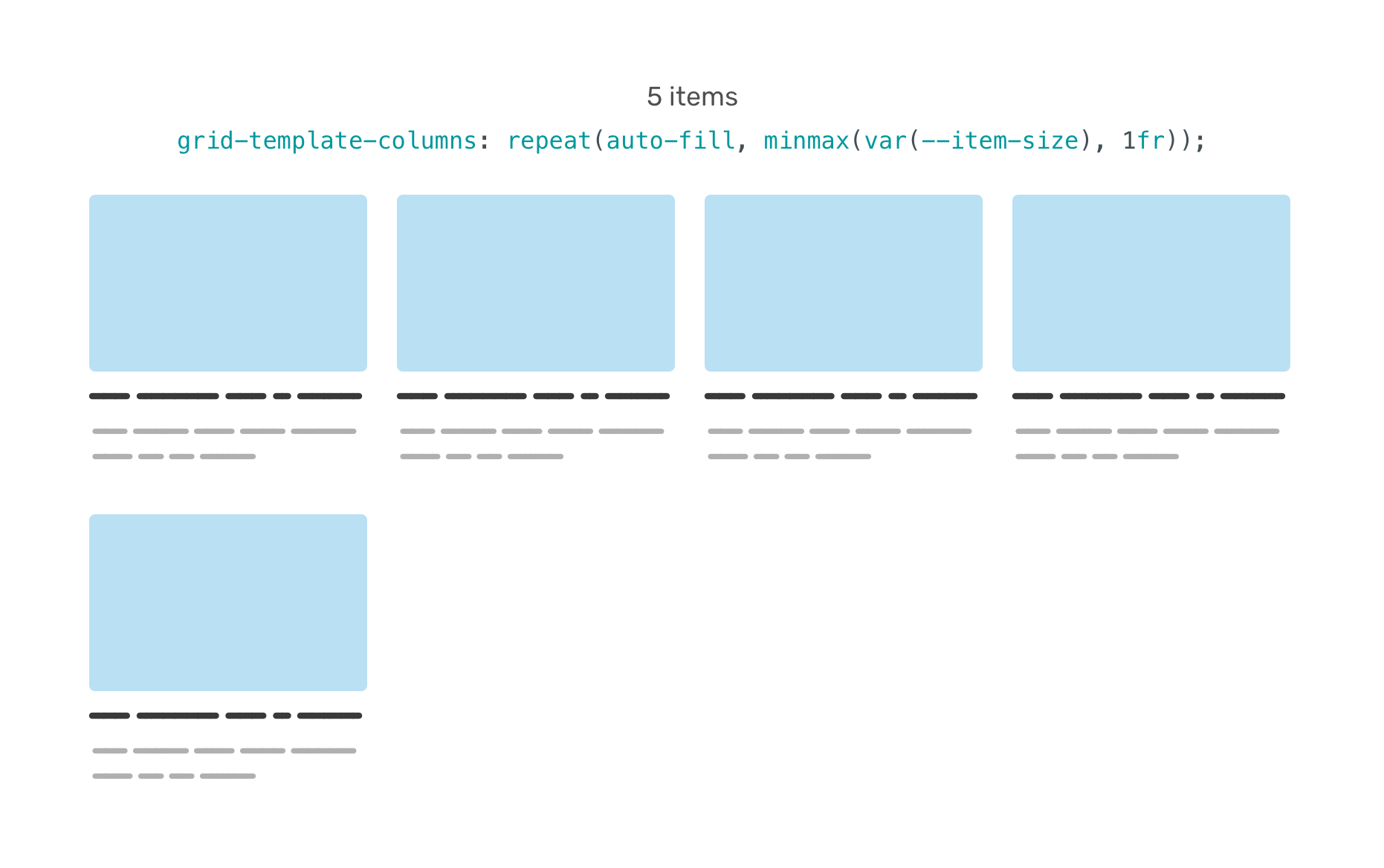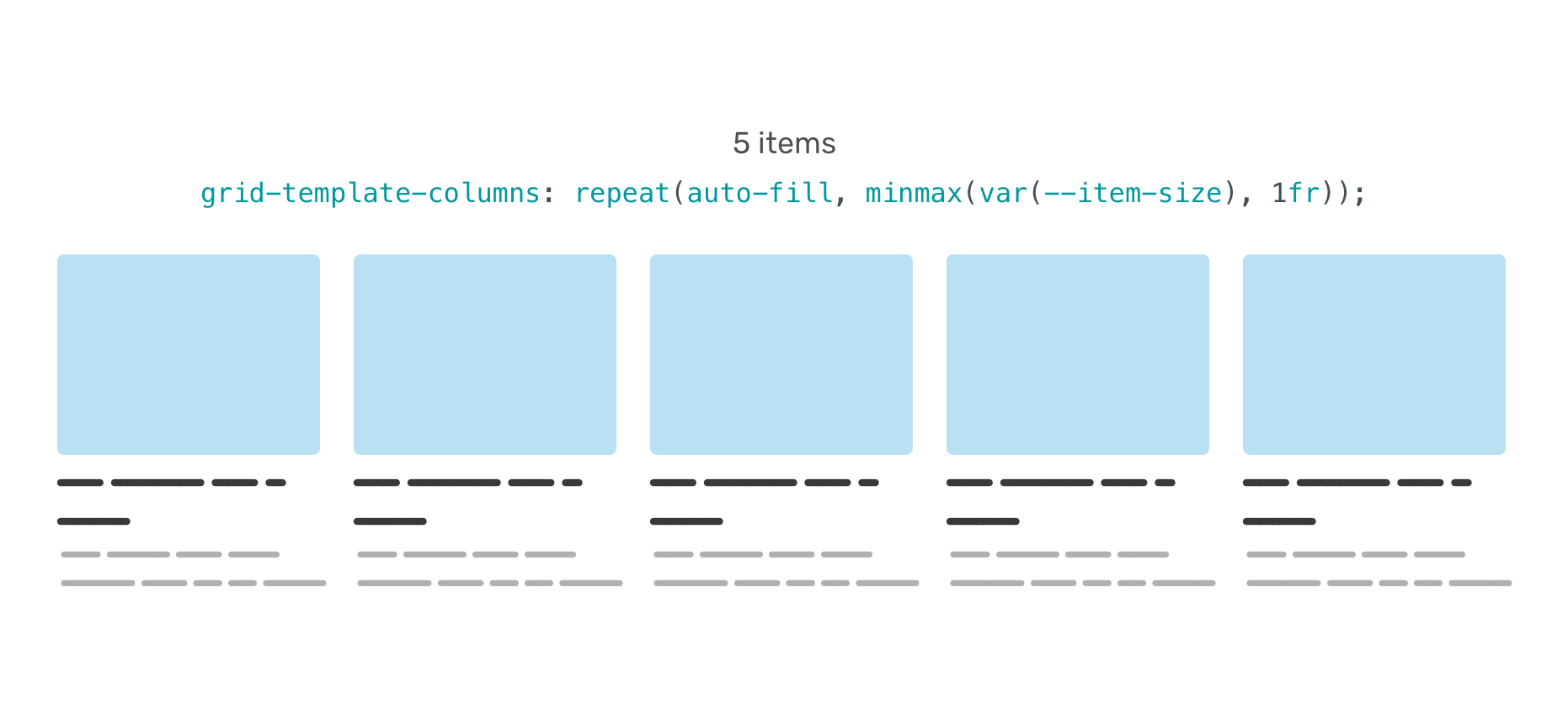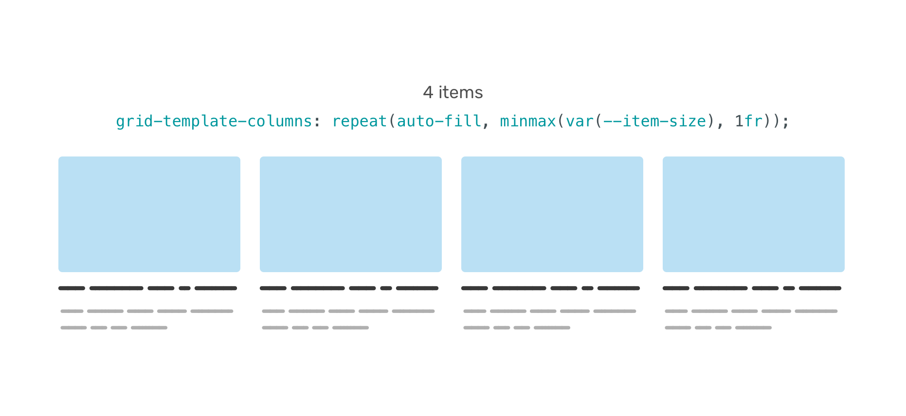 With CSS grid, we can use the minmax() function to create truly responsive and auto-sizing grid items. However, this might not be enough. We also want to change the grid based on the number of items.