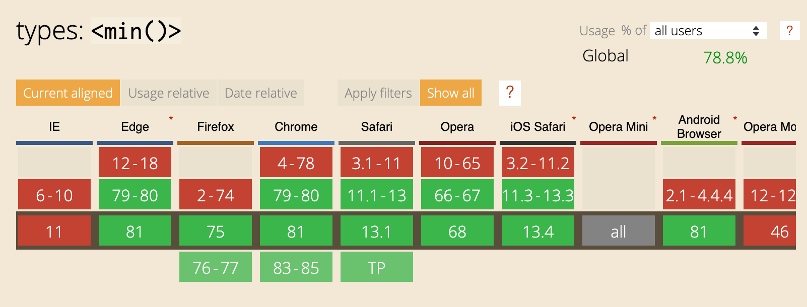 The first thing I want to highlight is the browser support since this is a new thing. The support for min and max is equal:
