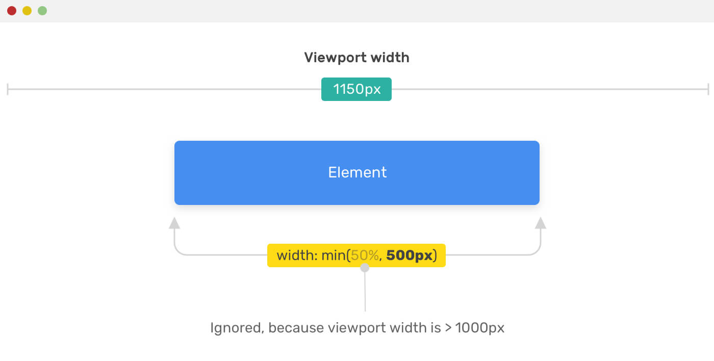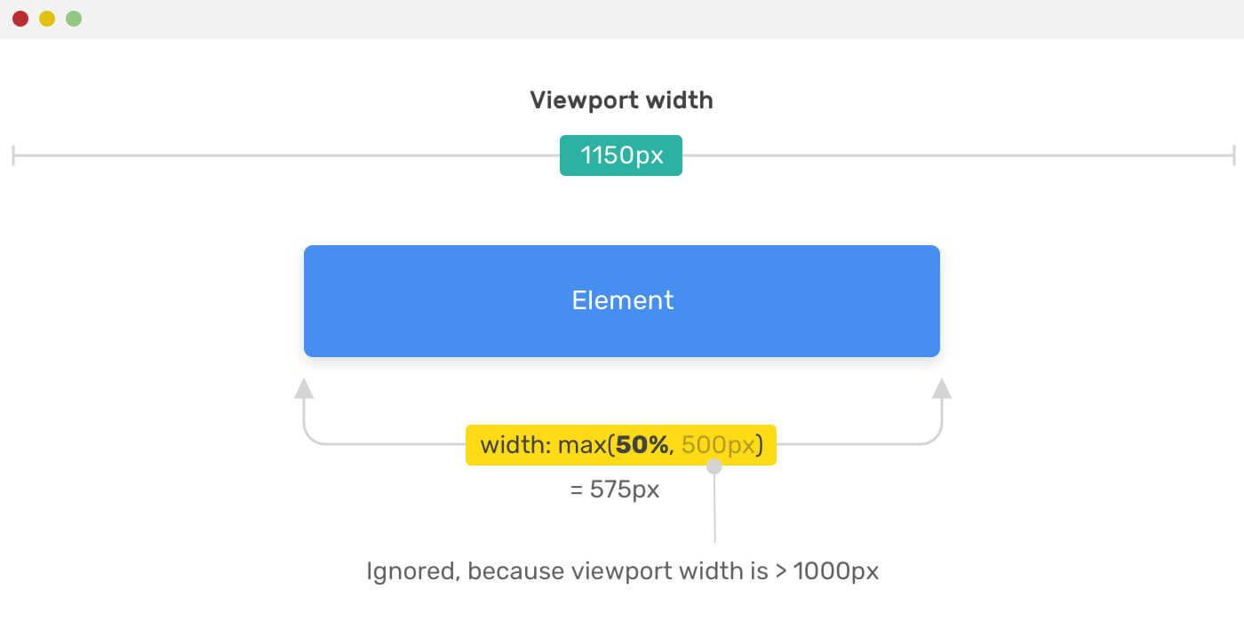 Otherwise, if the 50% computes to a value more than 500px, then the 50% will be used as a value for the width. It’s the opposite of min() function.
