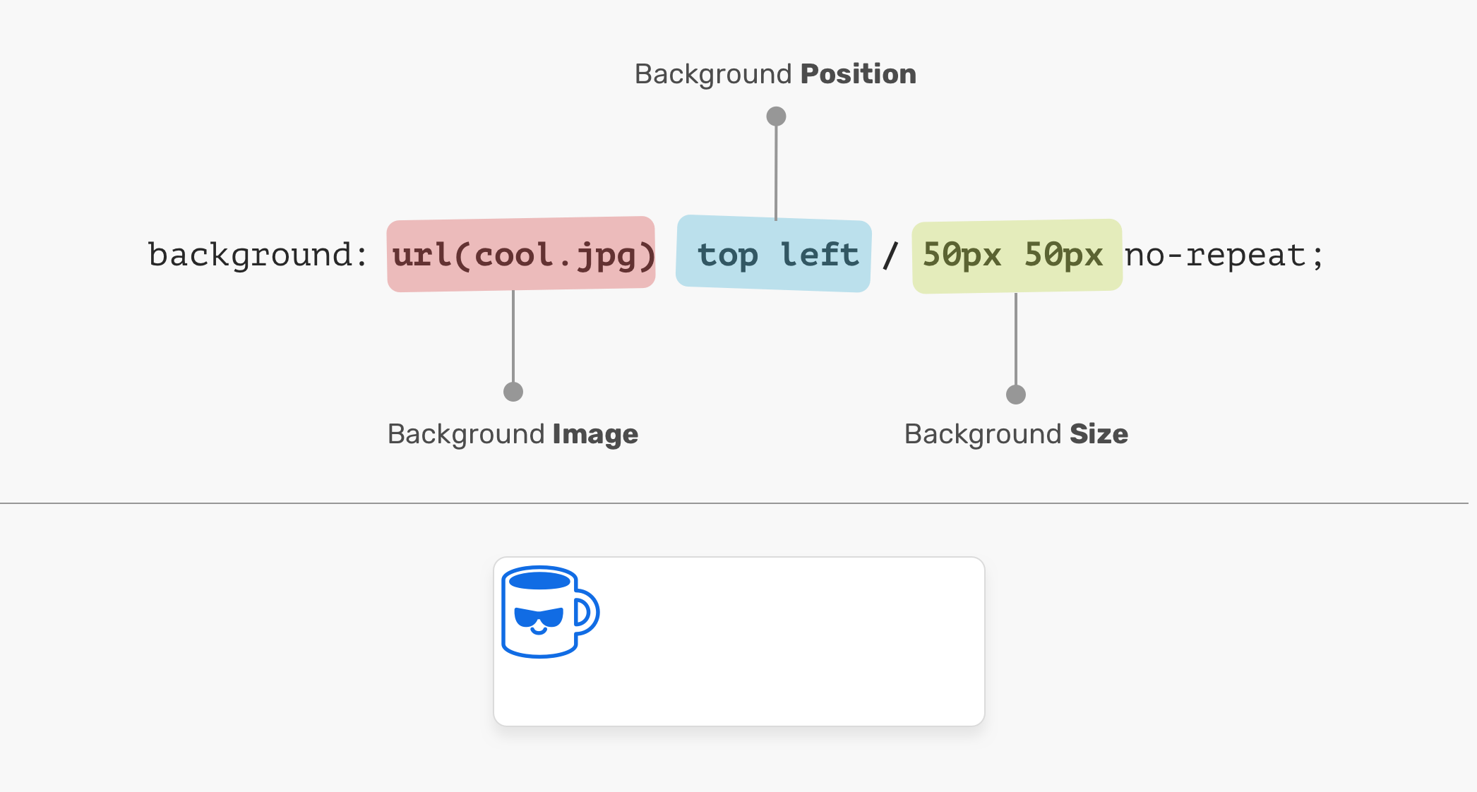 The background image is positioned at the top-left corner of the element, with a size of 50px * 50px. It’s important to understand and remember the order of the position and size.