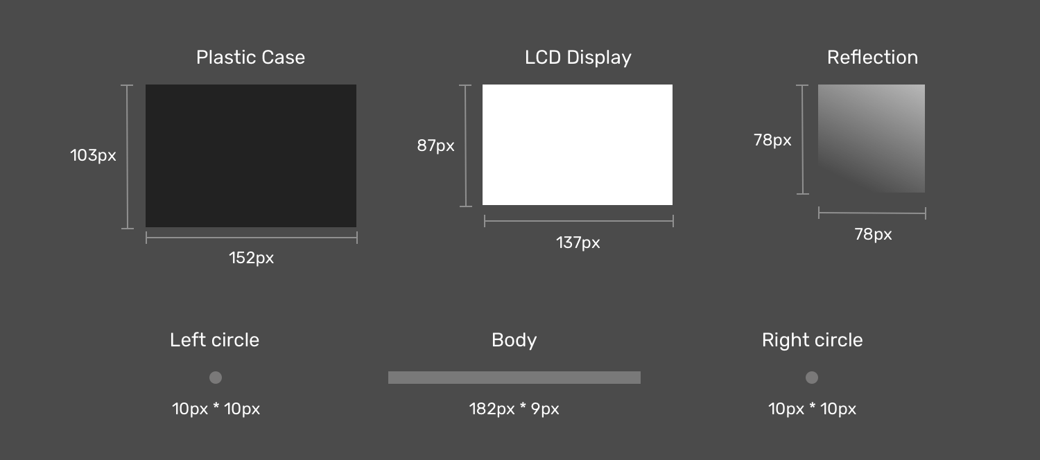 Notice how when the laptop items are dissembled, it’s easier now to think about how to implement this as multiple CSS backgrounds now. If you noticed, I created two circles to act as the rounded corners for the body since there is no direct way of doing a gradient with rounded edges.