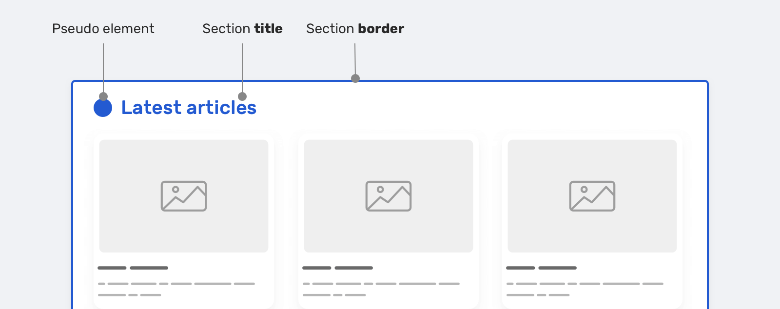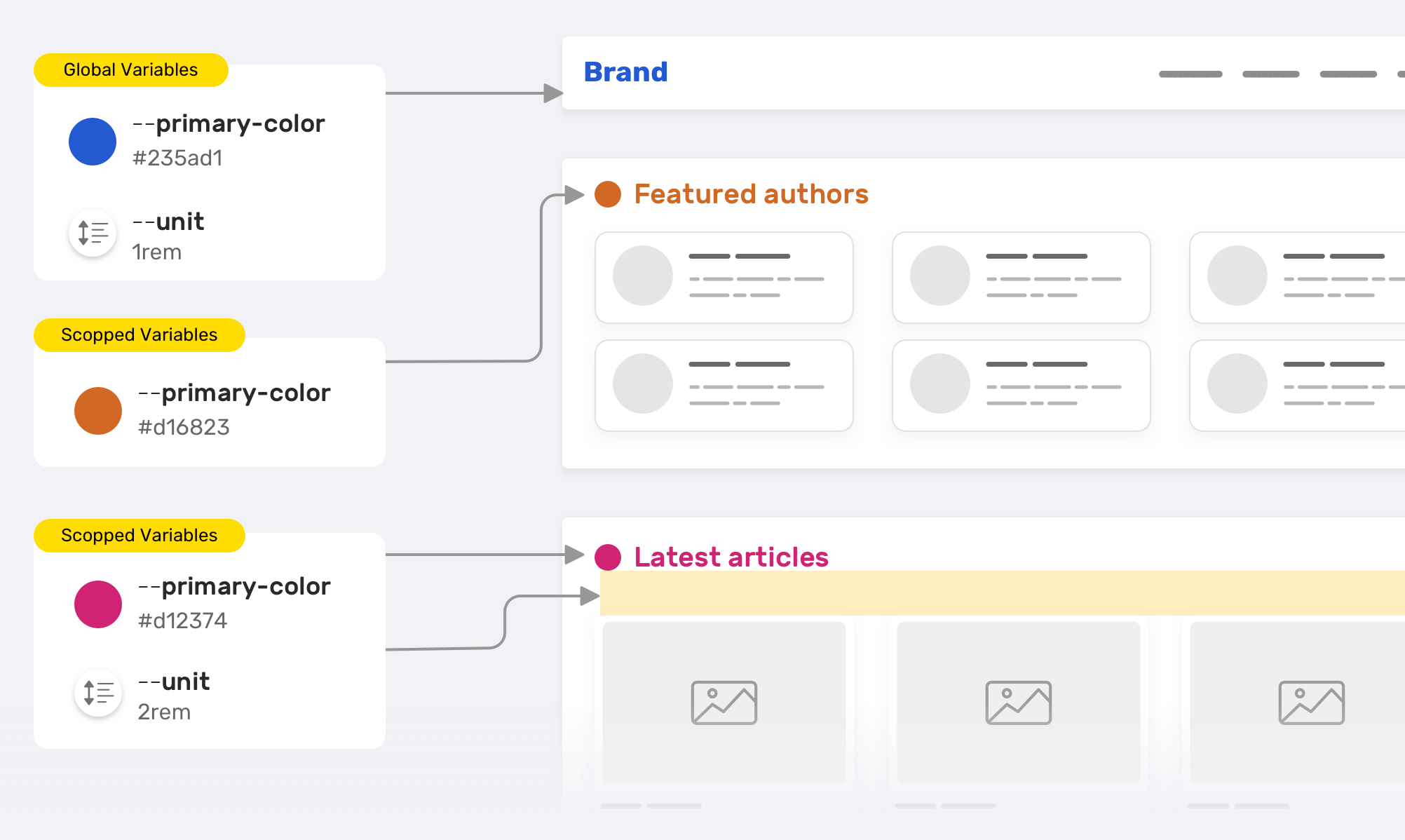 We have --primary-color that is used for the section title color. We want to customize the color for the featured authors and the latest articles sections, so we override it. The same thing applies to the --unit variable. Here is the CSS version for the figure above.