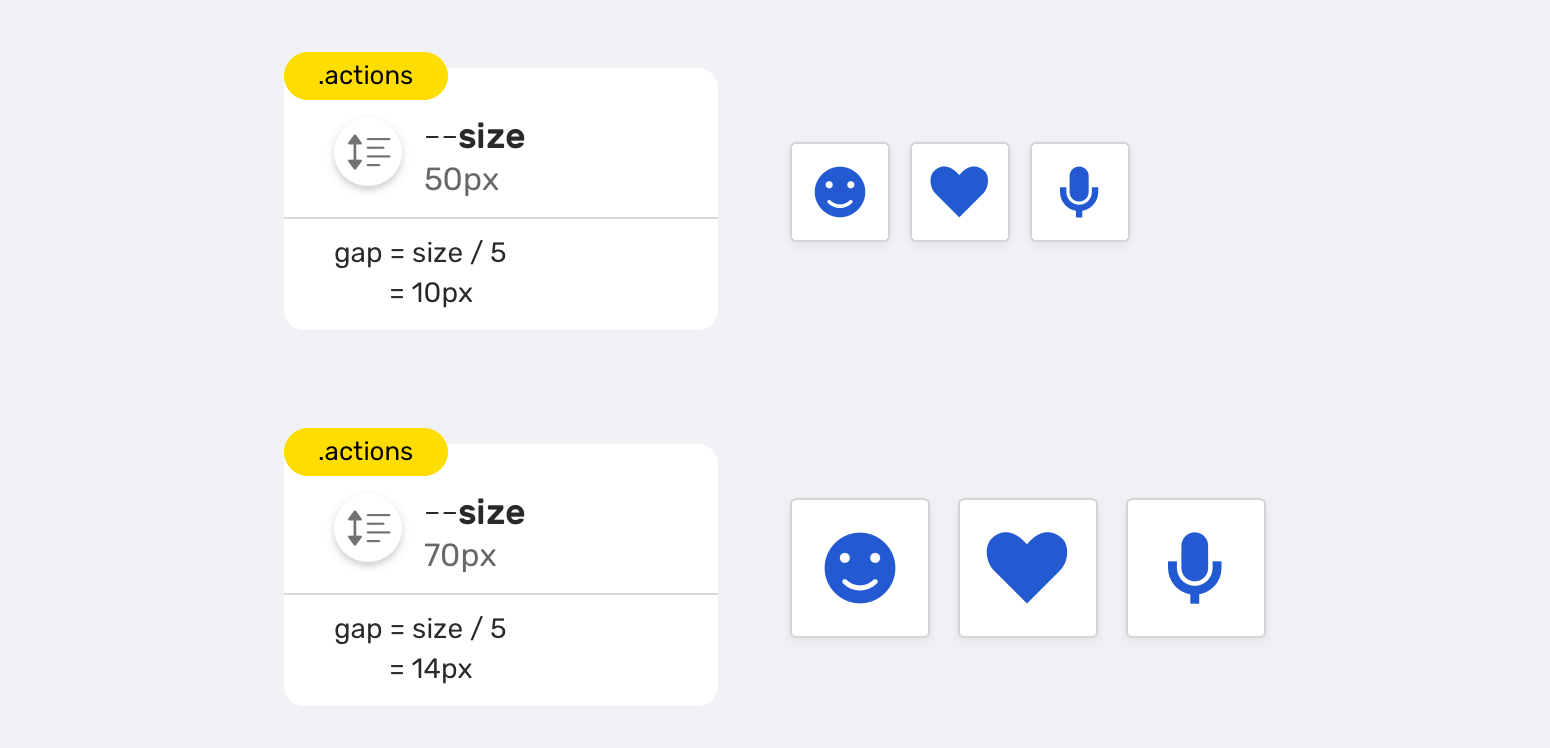 By changing the variable --unit within the scope of the button component, we created different variations of the button.