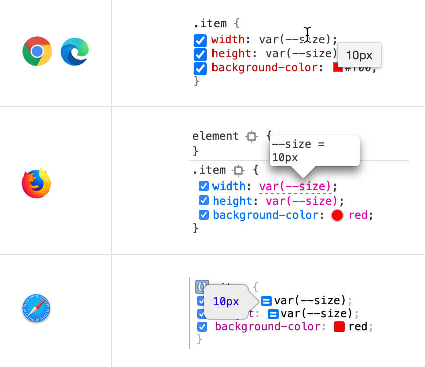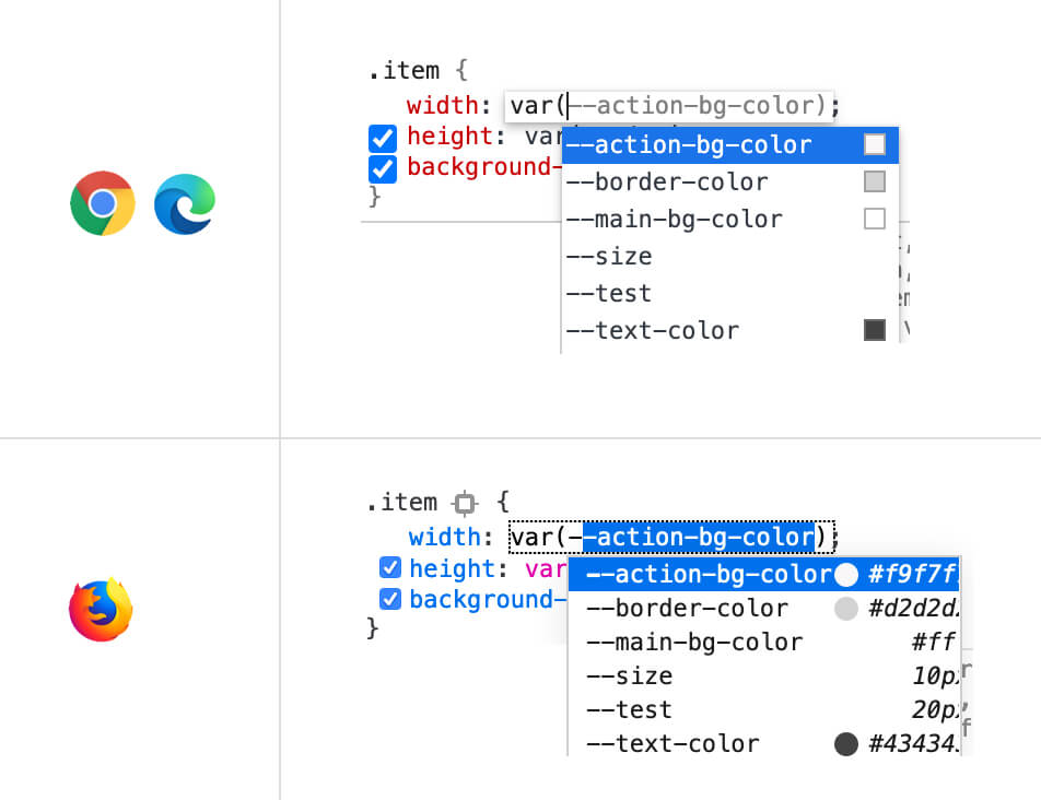 Isn’t it useful to see a visual indicator for the color or background value when you’re using a CSS variable? Chrome and Edge show that.