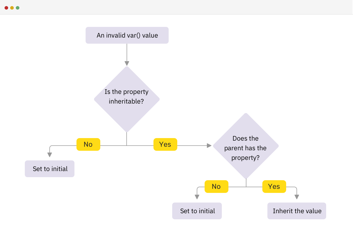 The above is technically called invalid at computed-value time, which happens when the var() references a CSS variable with its initial value or it’s using a valid CSS variable with an invalid value for the CSS property.