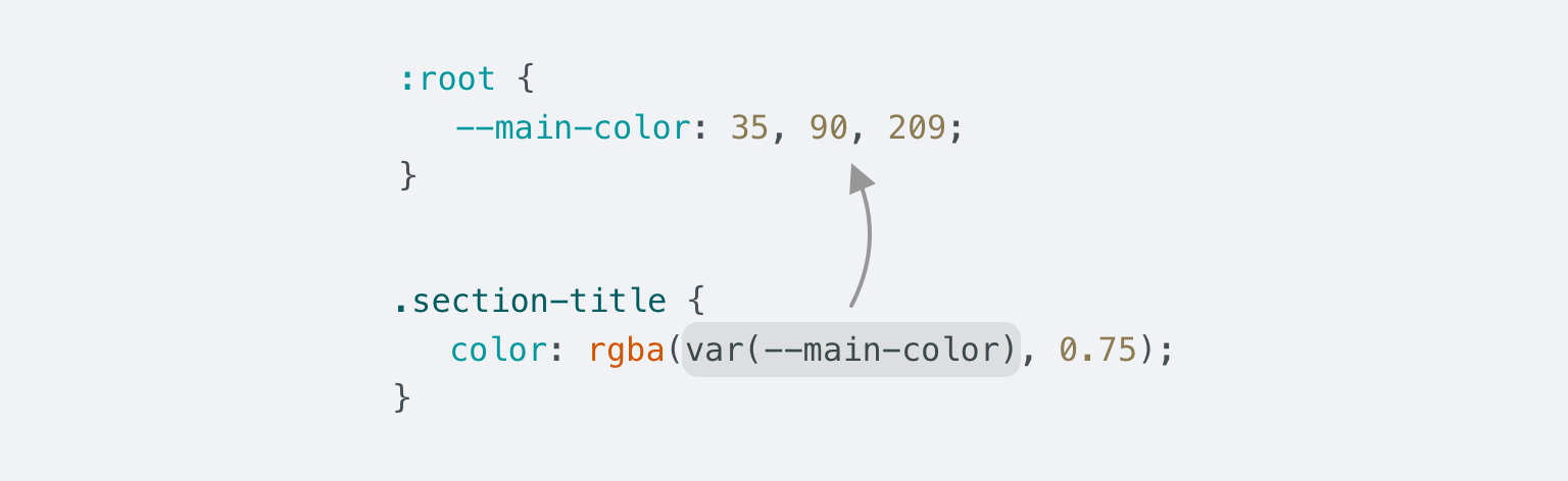 In the example, we have a rgba() function, and the RGB values are stored in CSS variable, separated by a comma. This can provide flexibility in case you want to tweak the alpha value depending on the element.