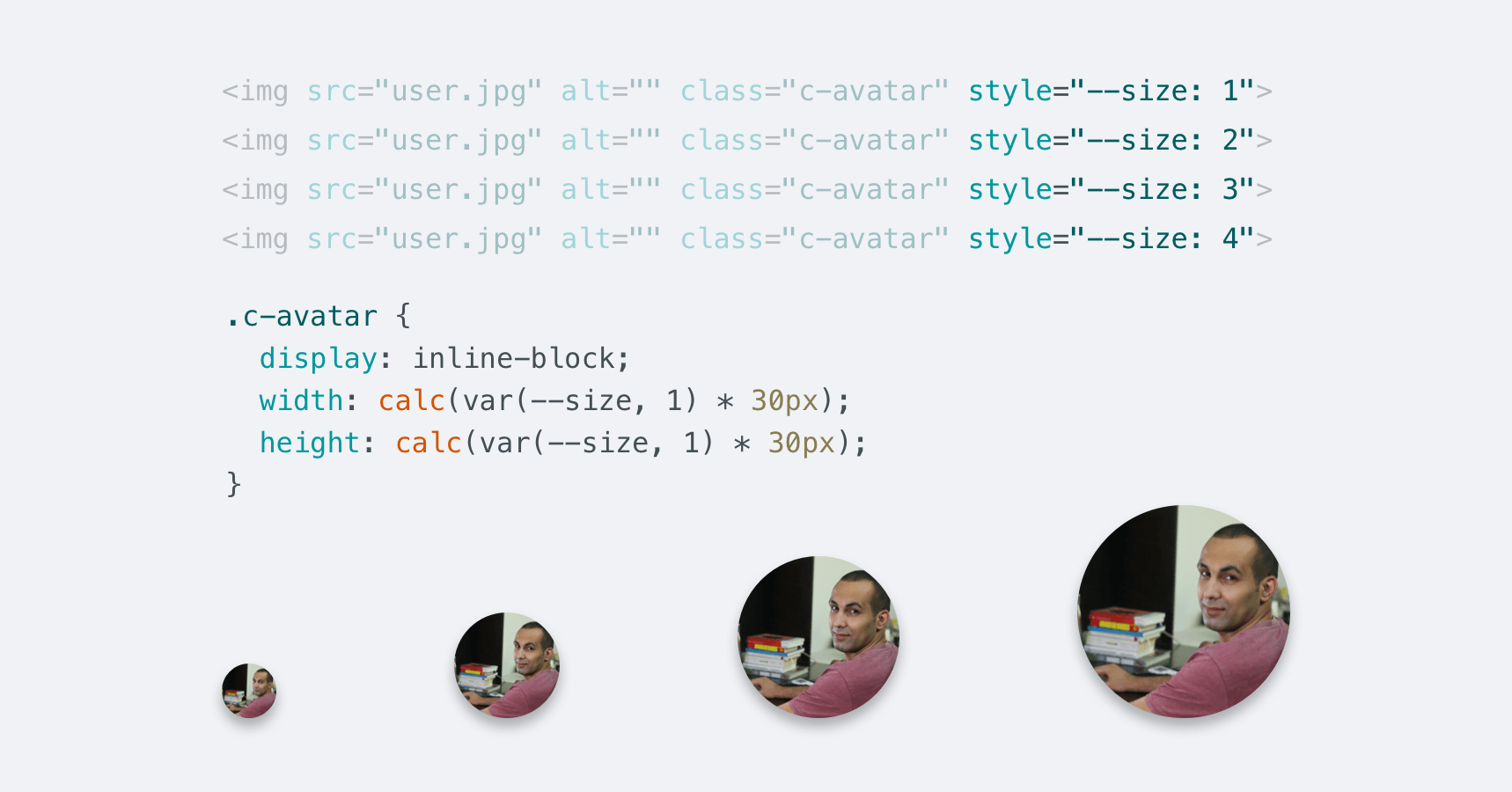 We might have variations of the avatar. I set the default value to 1, and so the default size is (30px * 30px). Notice the different class variations and how changing the --size value results in changing the size of the avatar.