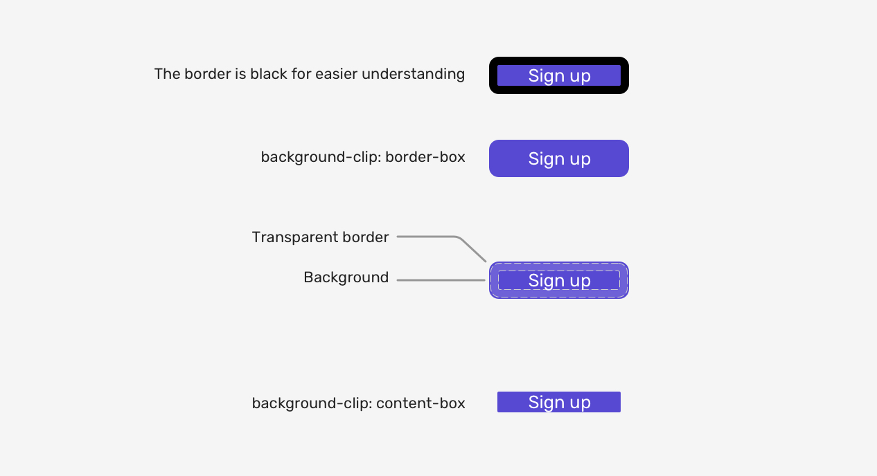 We have a button with a 6px black border. It doesn’t have padding for the sake of explaining the concept. Suppose that box-sizing is set to border-box, the border will be included within the size of the button. As a result, the border is appearing above the background.