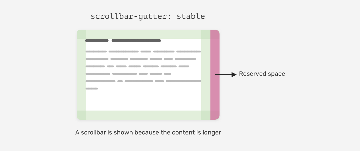 Thankfully, this can be solved now with scrollbar-gutter (supported in Chromium-based browsers, v94+). It works in a way that lets us reserve the space in advance. The default value is auto, and the other value is stable. It’s also worth mentioning that there is an optional value both-edges which shows the gutter on both sides.