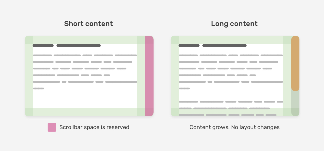 That way, when the content grows, it won’t shift because the browser already reserved a space for it. Here is a visual that shows the two cases (Short content vs long content).