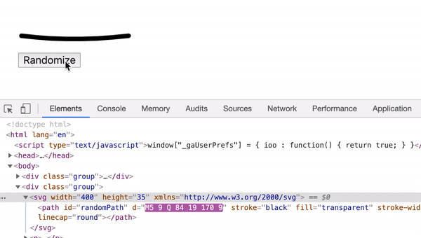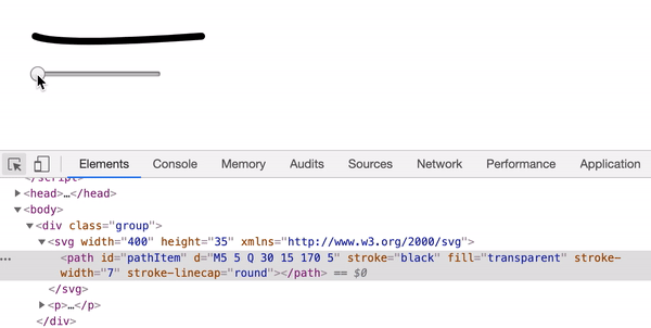 As a first test, I need to check how can I control the path length. The x value in the end point (170, 5) is responsible for the path length, so I will modify it with Javascript.