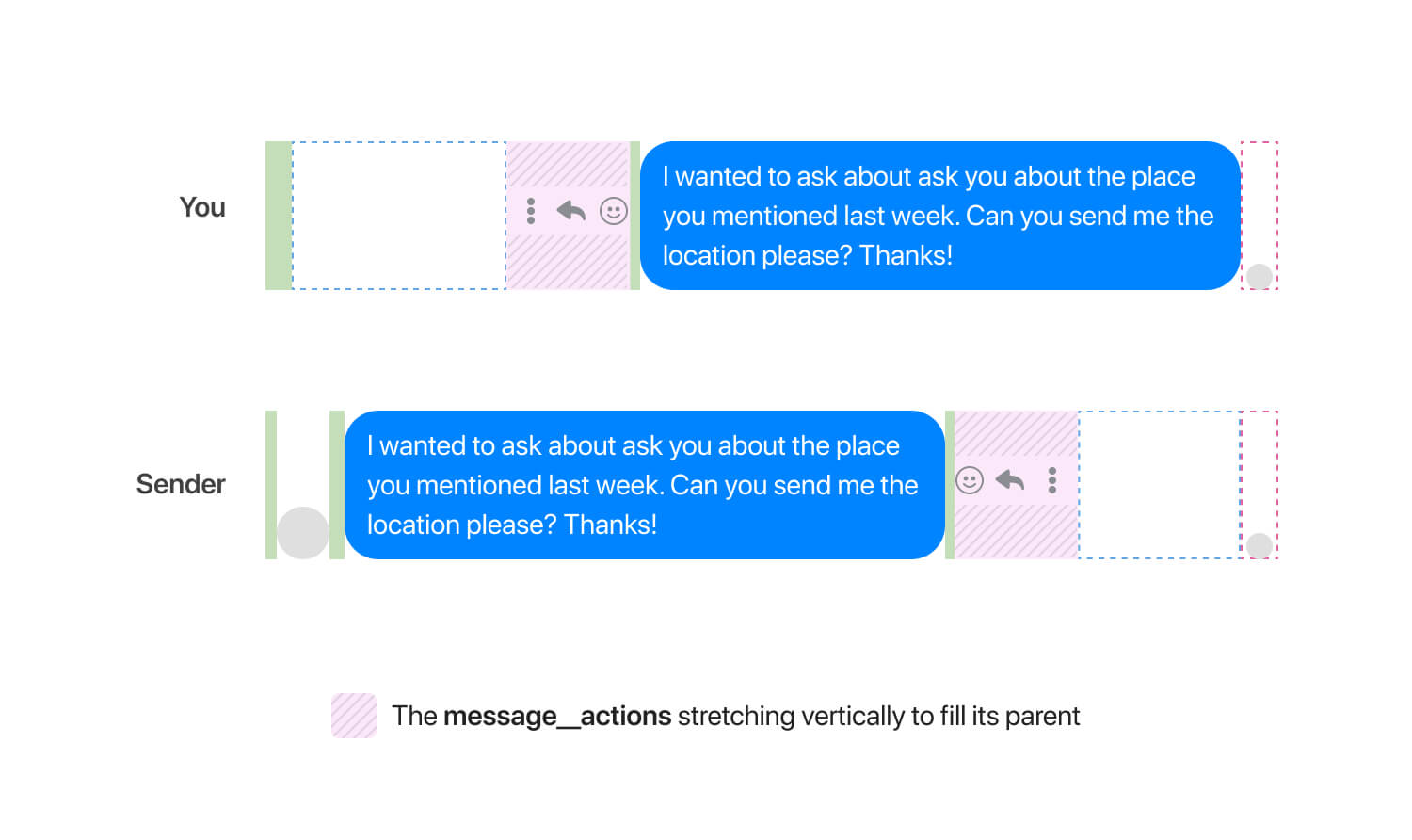 - An inner container that has two descendants: the chat bubble itself, the action menu, and a spacer element.