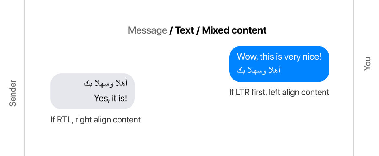 It’s worth mentioning that the message bubble can handle mixed content by using the dir=auto HTML attribute.