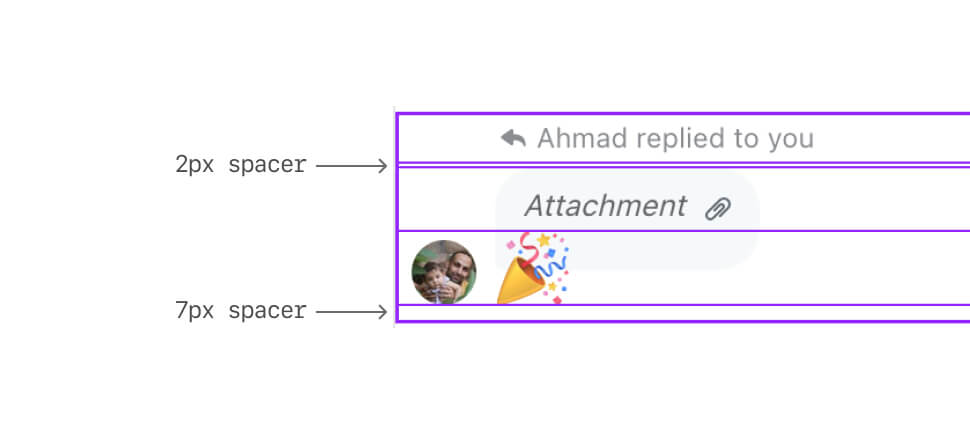 Now that you know how the markup looks for each message row, let’s go into how the spacing is handled between messages. The spacing is handled via spacer components, not margins or anything else.