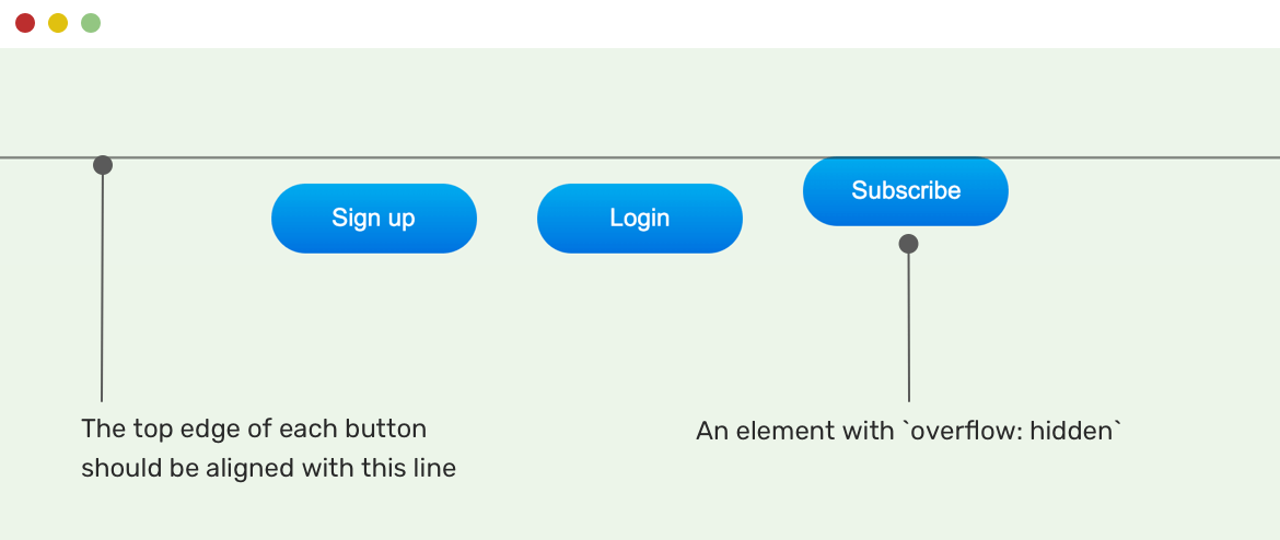 We have three inline-block elements, and one of them has overflow: hidden. You will notice that the button with overflow hidden is not aligned with the baseline of other siblings.